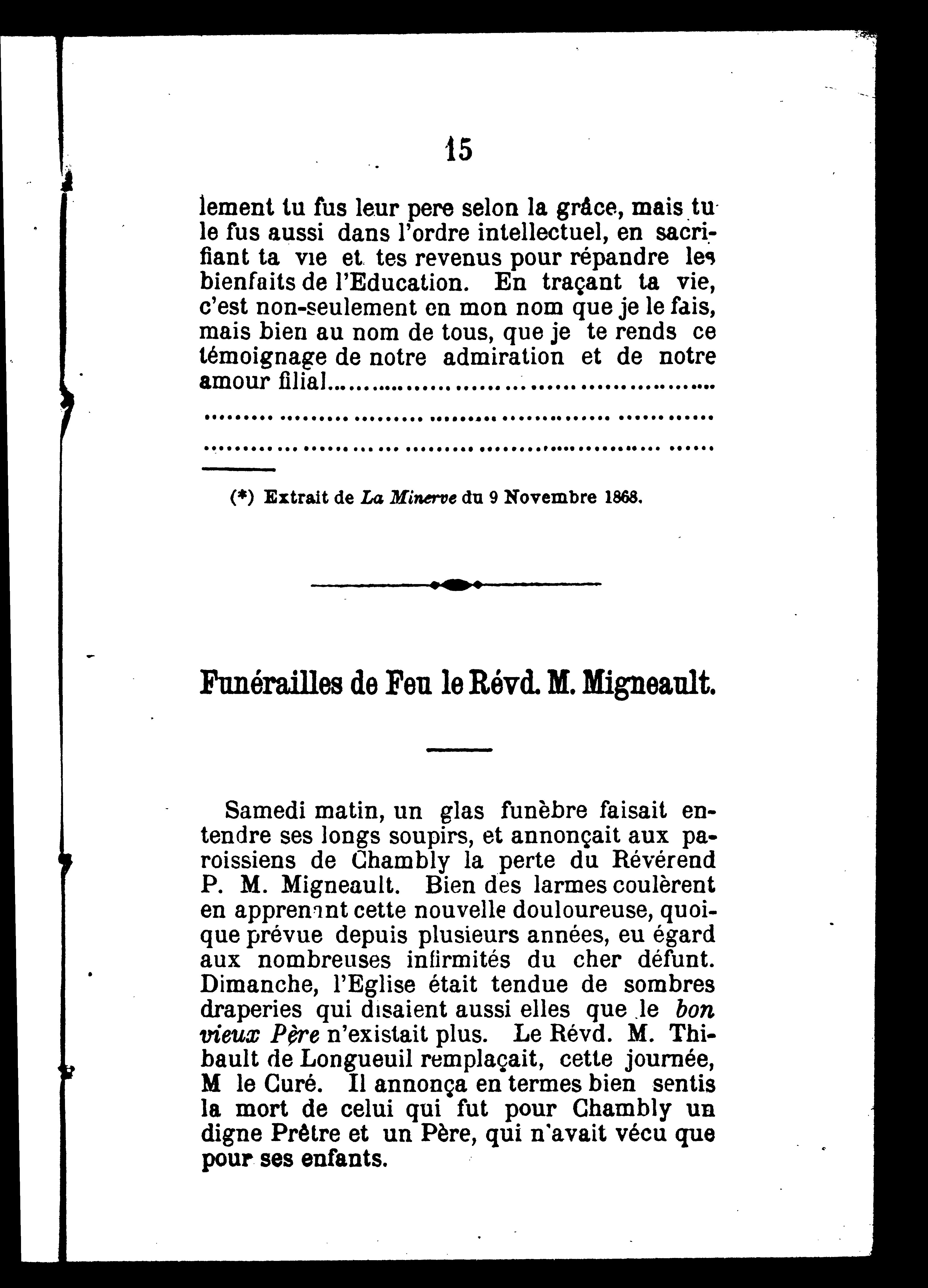 Souvenir du Révérend Pierre Marie Migneault [sic] : archi-prêtre, vicaire de Québec, missionnaire de la Nouvelle-Écosse, ancien curé de Chambly, fondateur du Collège de St. Pierre de Chambly, vicaire-général des États-Unis et missionnaire apostolique : dédié très respectueusement aux membres du clergé catholique, et aux anciens élèves du Collège de Chambly