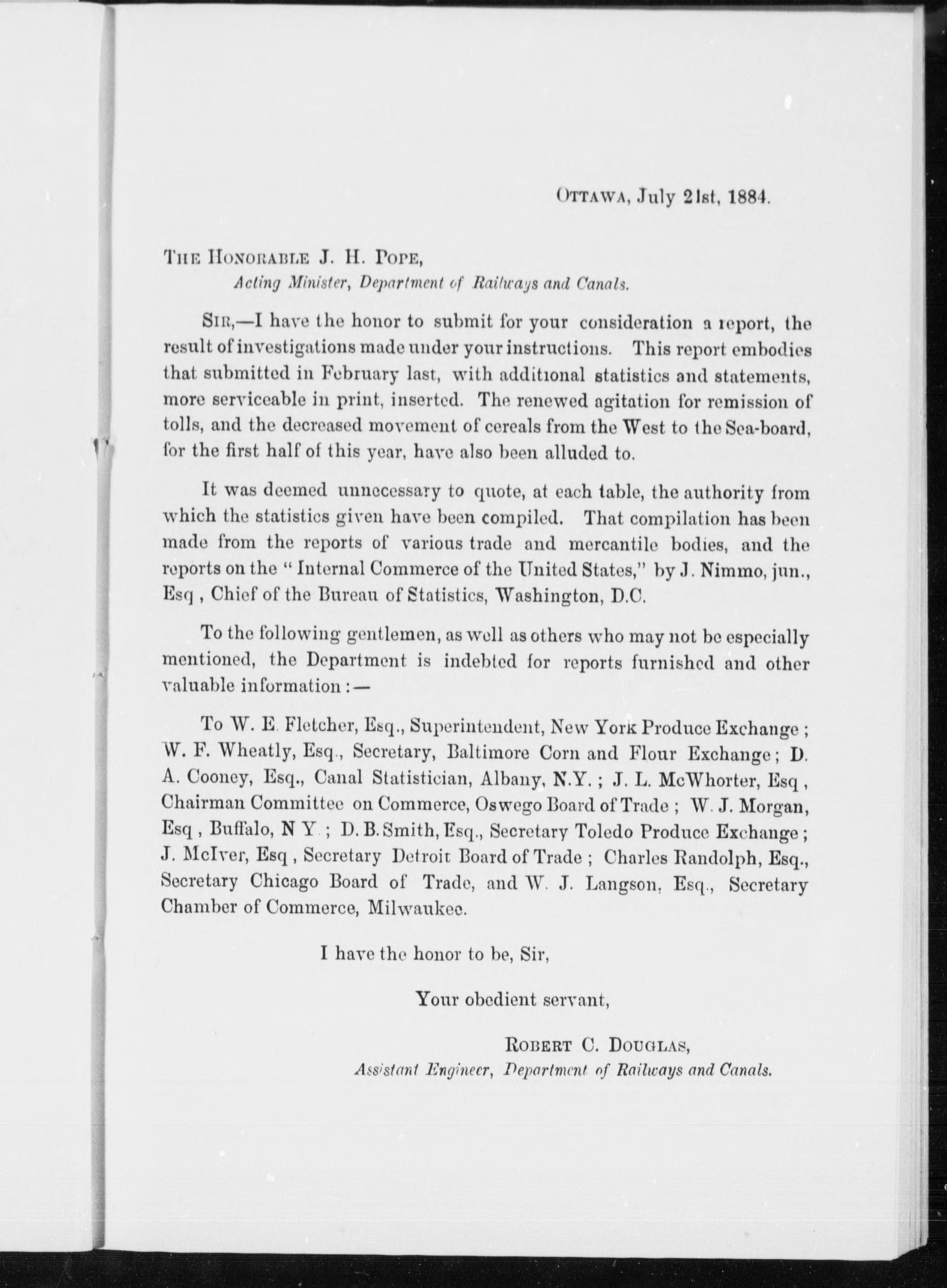 - Report to the Hon. J.H. Pope, Acting Minister, Department of Railways and Canals, on the necessity of deepening the Welland Canal : and on transportation, commerce and canal tolls, affecting the St. Lawrence water-route to the sea-board