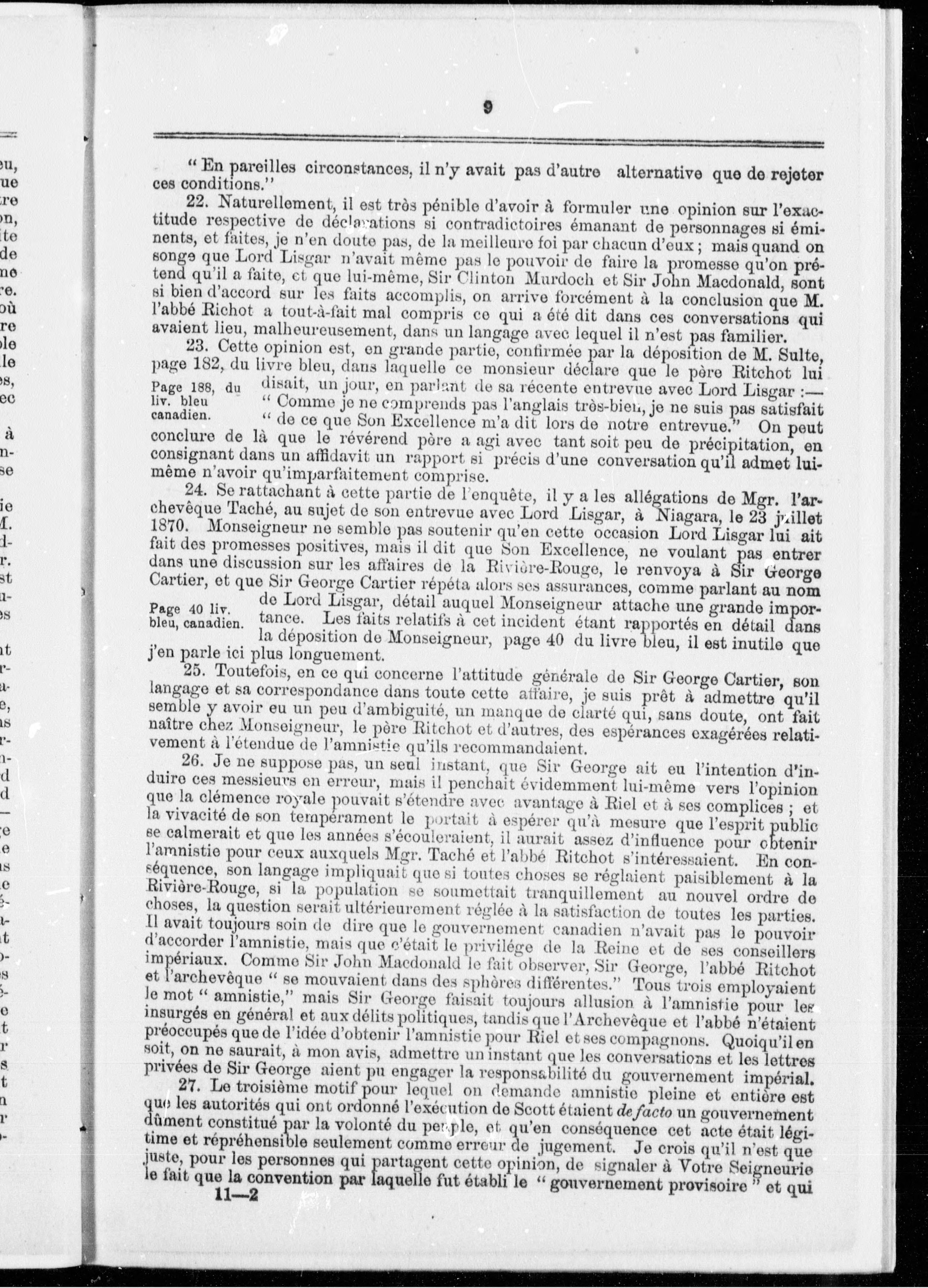 - Message du Gouverneur-Général, transmettant copie de la correspondance relative à la sentence de mort prononcée contre Ambroise Lépine pour le meurtre de Thomas Scott à Fort-Garry.
