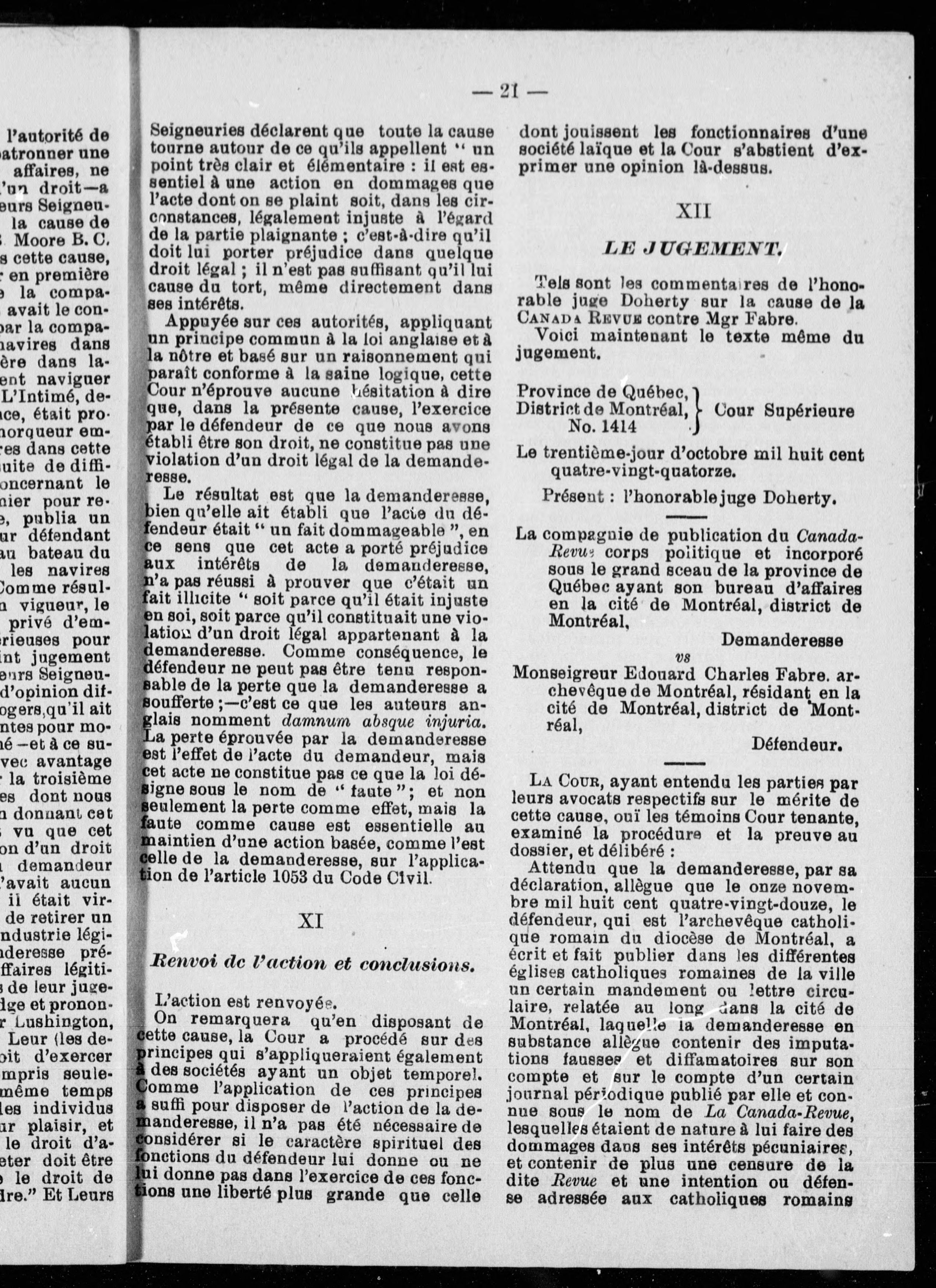 Les droits de l'évêque : la "Canada revue" vs Mgr Fabre : jugement de l'Honorable Juge Doherty (traduit de l'anglais).