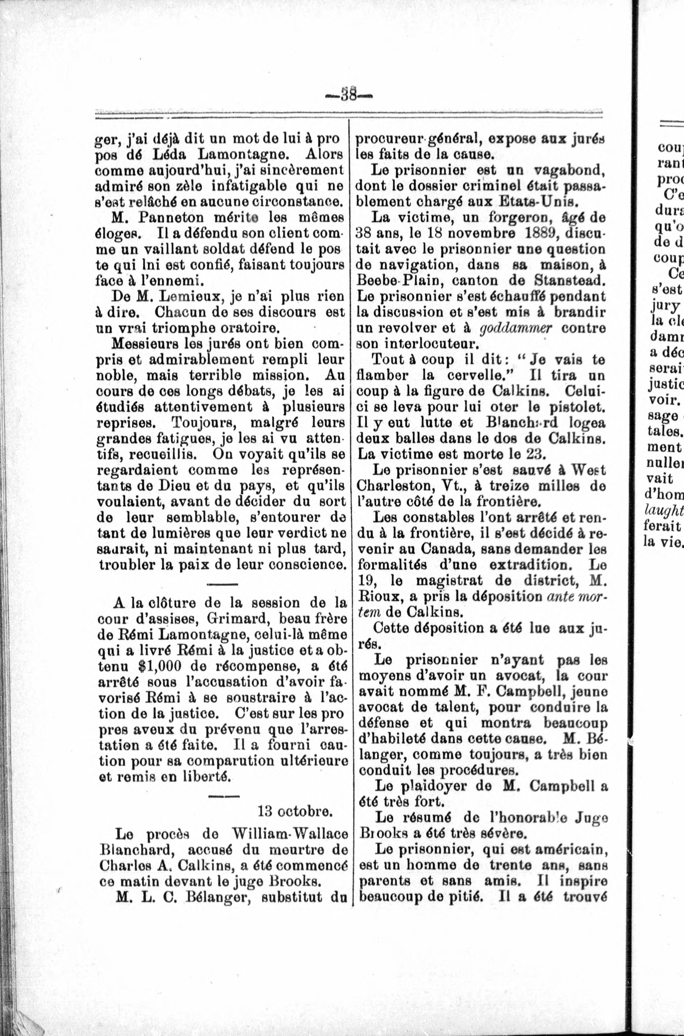 - Procès de Rémi Lamontagne, accusé du meurtre de Napoléon Michel le 18 juillet, 1888, et condamné, le 12 octobre, 1890, à être pendu le 19 décembre ; suivi du procès de William Wallace Blanchard, accusé du meurtre de Charles A. Calkins le 18 novembre, 1889, et condamné à eptre pendu le 12 décembre.
