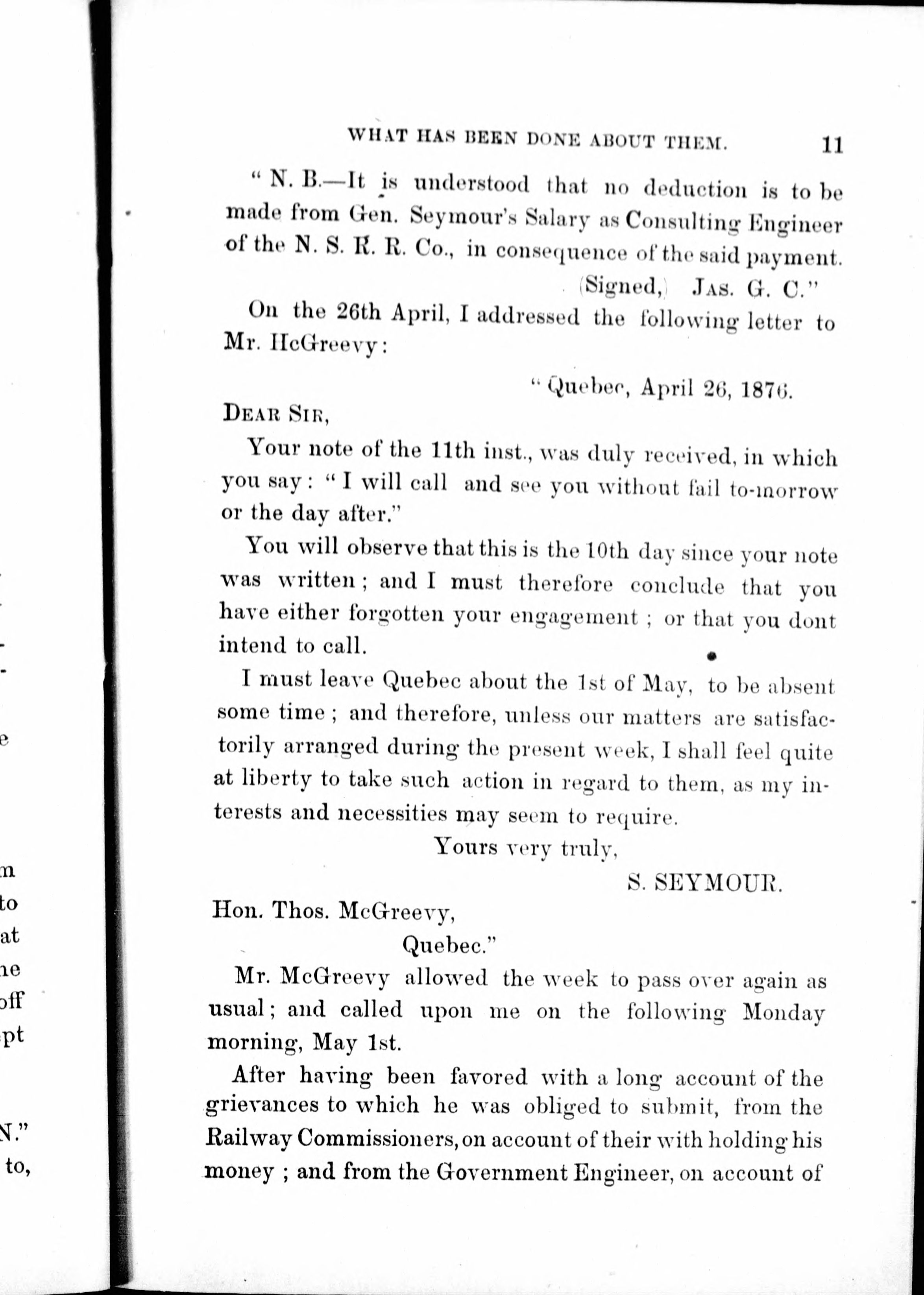 - North Shore Railway, statement of facts in relation to certain special agreements between Hon. Thomas McGreevy, contractor and Silas Seymour, general consulting engineer : dated respectively, June 21, 1875 and August 18, 1875 : and also, "What has been done about them".