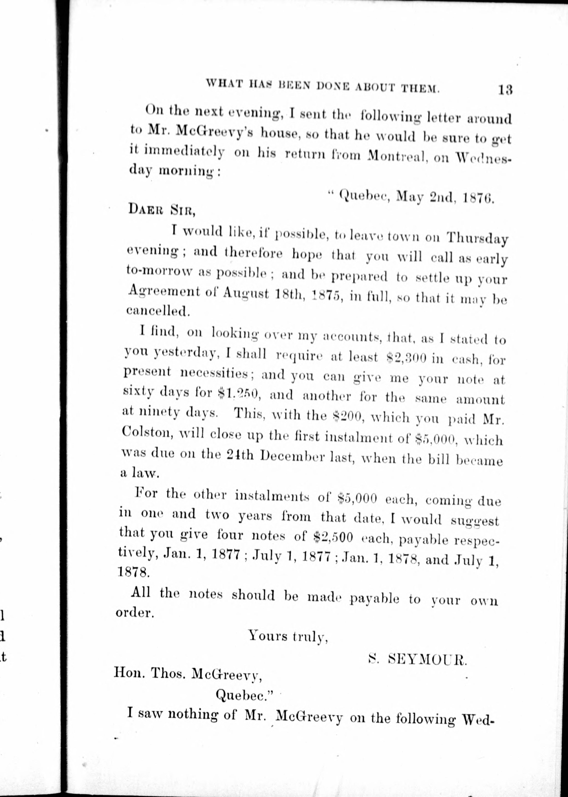 - North Shore Railway, statement of facts in relation to certain special agreements between Hon. Thomas McGreevy, contractor and Silas Seymour, general consulting engineer : dated respectively, June 21, 1875 and August 18, 1875 : and also, "What has been done about them".