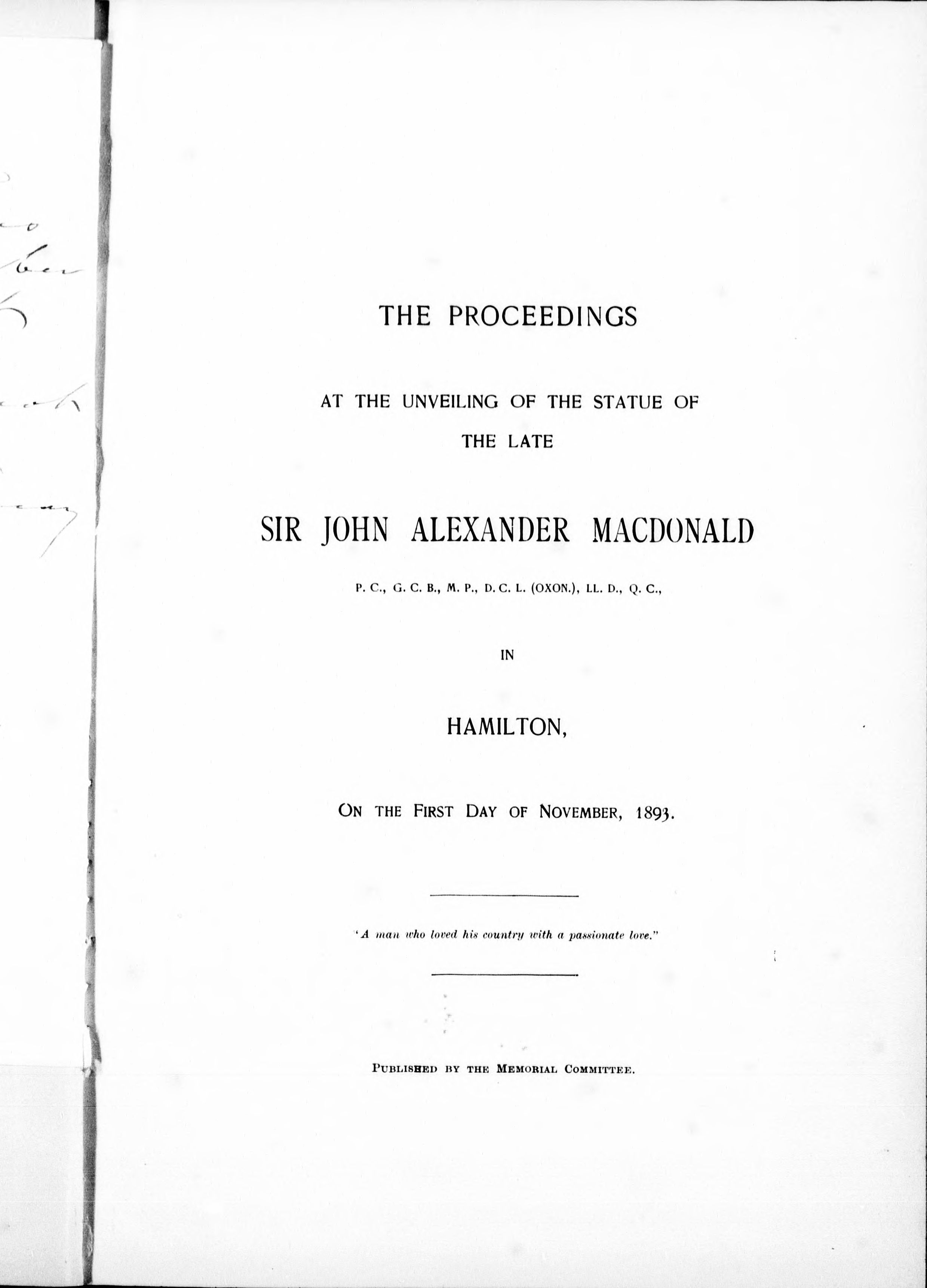 The proceedings at the unveiling of the statue of the late Sir John Alexander Macdonald, P.C., G.C.B., M.P., D.C.L., (Oxon.), LL.D., Q.C., in Hamilton, on the first day of November, 1893.
