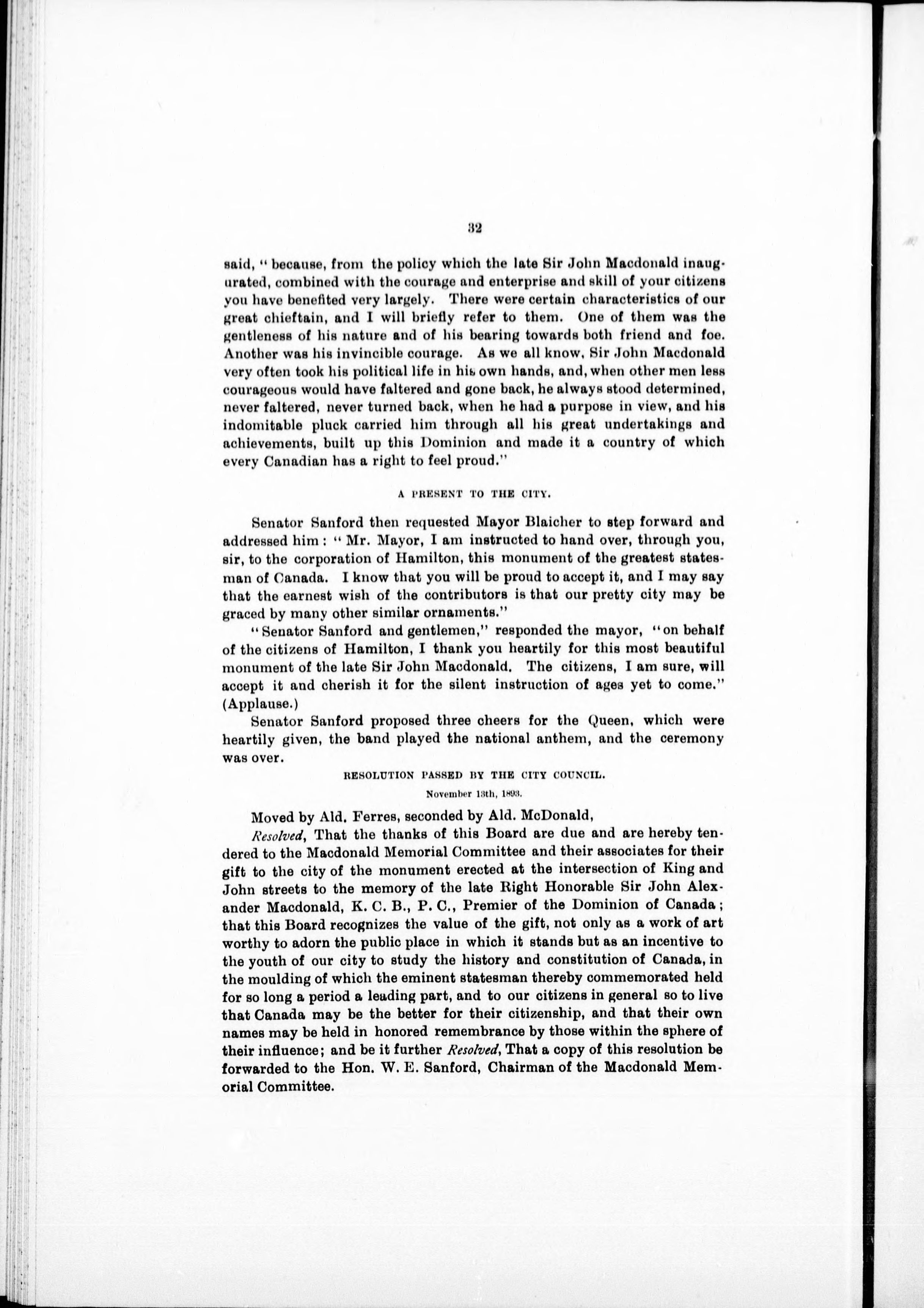 The proceedings at the unveiling of the statue of the late Sir John Alexander Macdonald, P.C., G.C.B., M.P., D.C.L., (Oxon.), LL.D., Q.C., in Hamilton, on the first day of November, 1893.