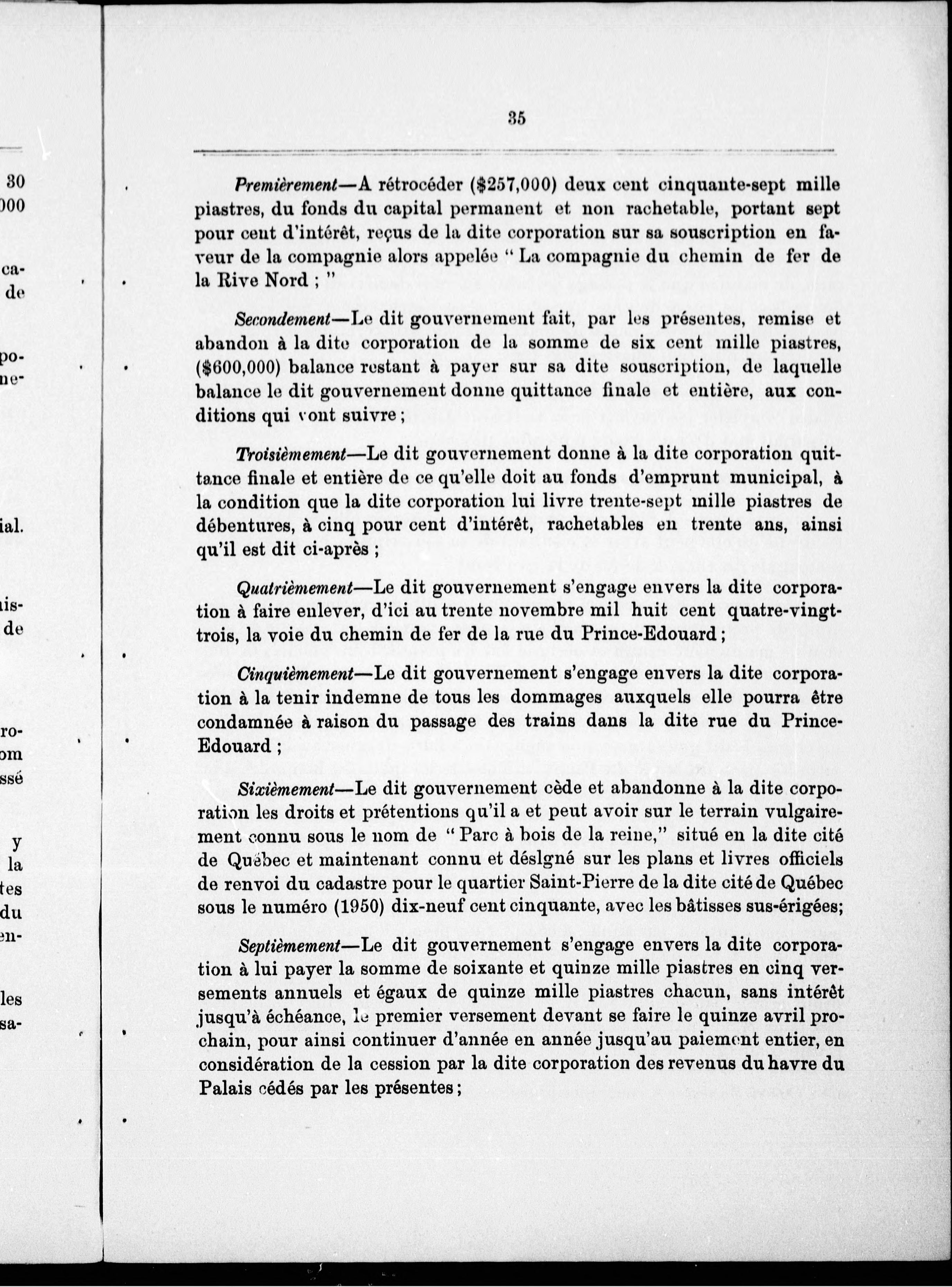 - Amendements à la Charte de la Cité : et correspondance et contrats entre le gouvernement, la cité de Québec et la compagnie du Chemin de fer du Nord, relativement au règlement concernant la souscription de la ville et au règlement avec la compagnie.