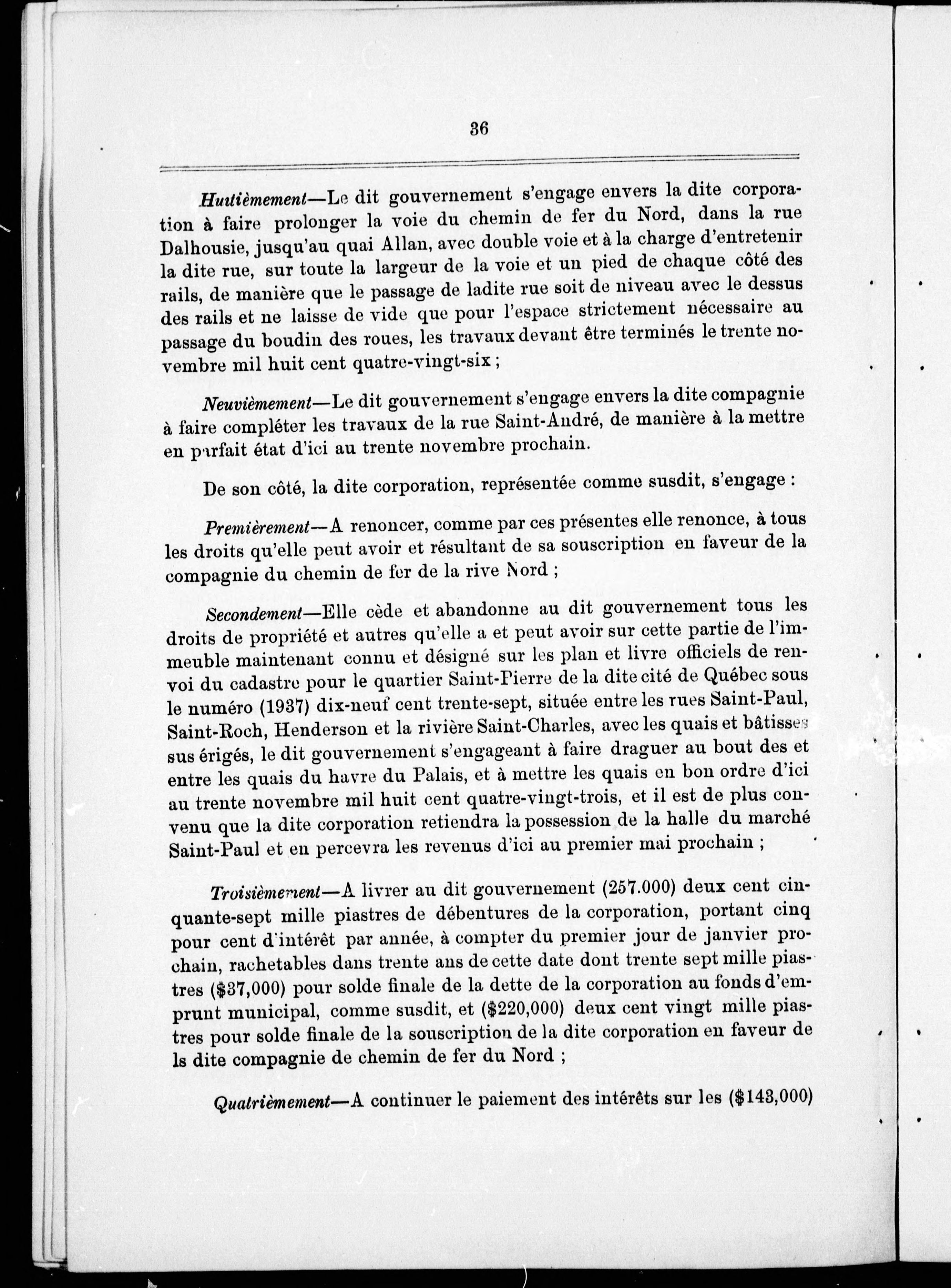 - Amendements à la Charte de la Cité : et correspondance et contrats entre le gouvernement, la cité de Québec et la compagnie du Chemin de fer du Nord, relativement au règlement concernant la souscription de la ville et au règlement avec la compagnie.