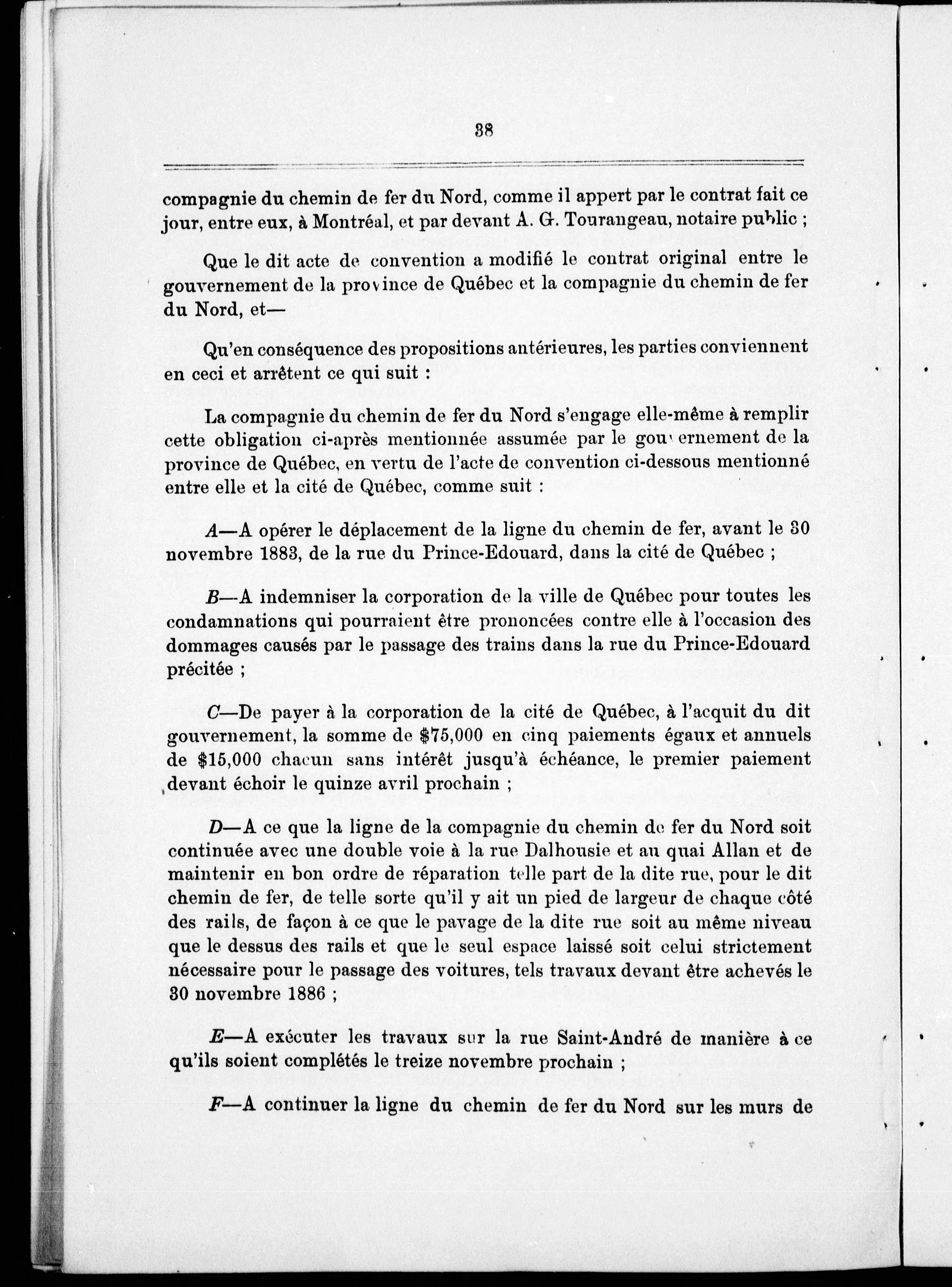 - Amendements à la Charte de la Cité : et correspondance et contrats entre le gouvernement, la cité de Québec et la compagnie du Chemin de fer du Nord, relativement au règlement concernant la souscription de la ville et au règlement avec la compagnie.
