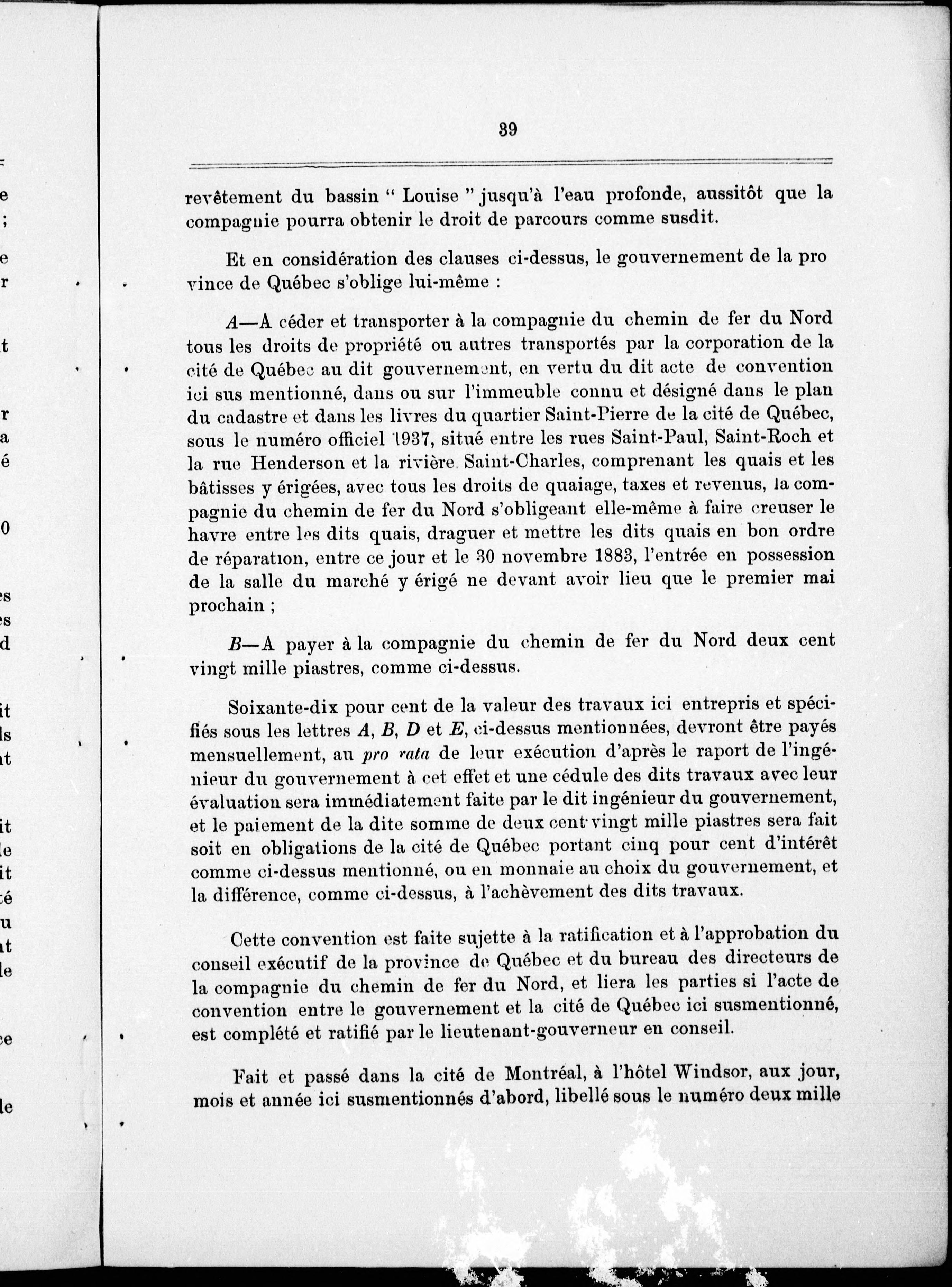 - Amendements à la Charte de la Cité : et correspondance et contrats entre le gouvernement, la cité de Québec et la compagnie du Chemin de fer du Nord, relativement au règlement concernant la souscription de la ville et au règlement avec la compagnie.