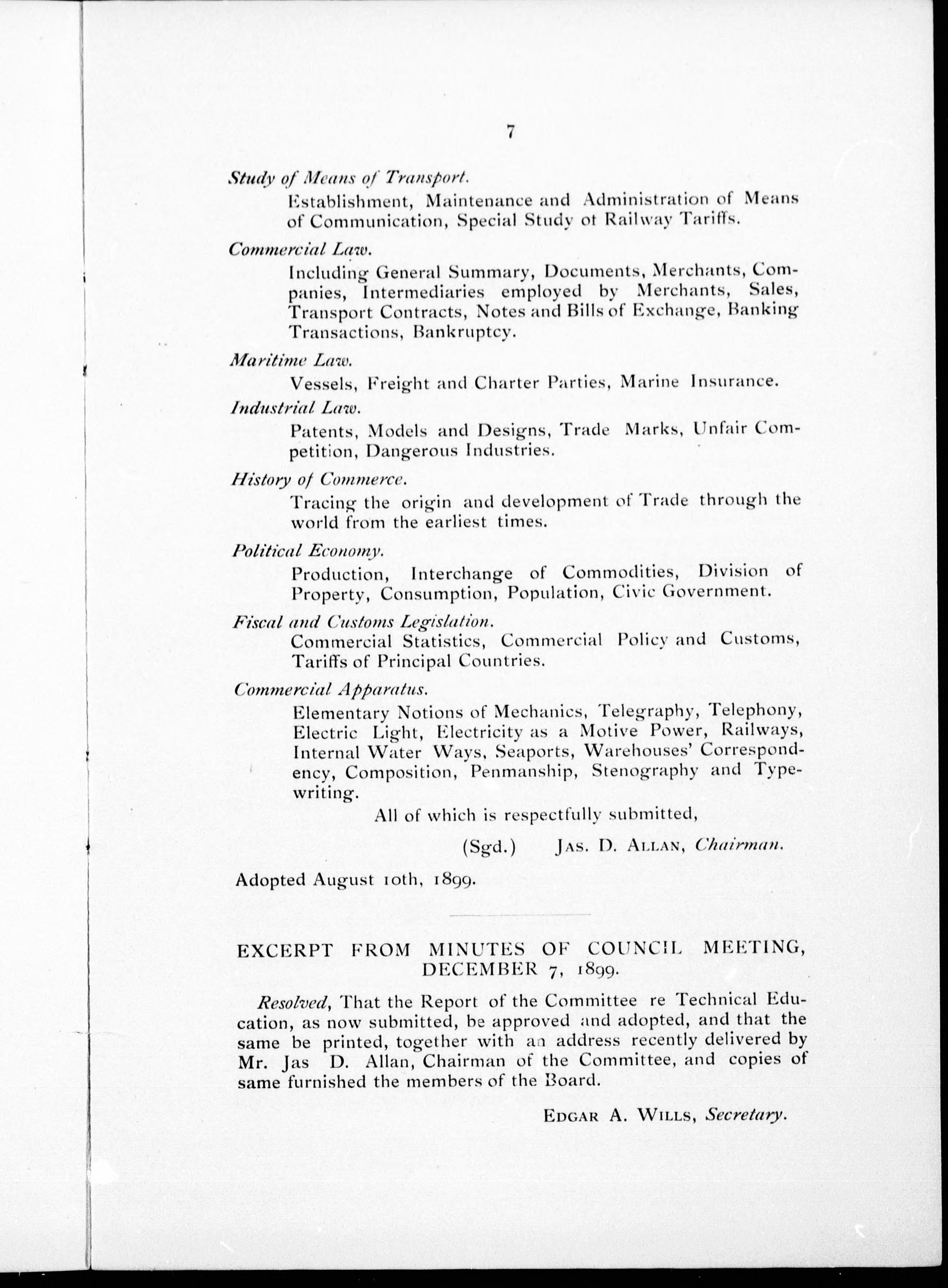 Report of the Council of the Board of Trade re technical education. Also an address by Mr. Jas. D. Allan, subject : technical education from a business standpoint, December 8th, 1899.
