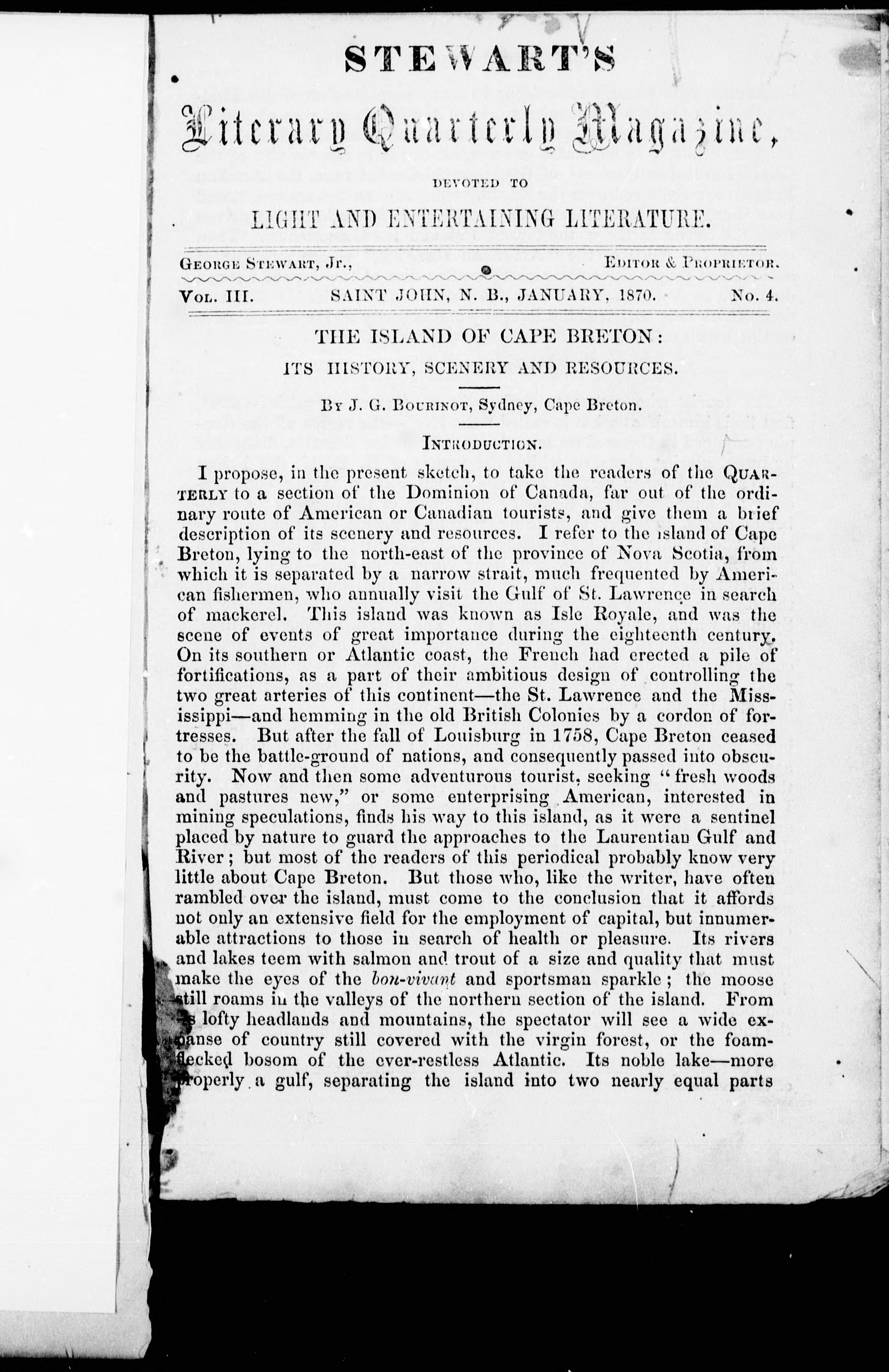 At head of title: Stewart's Literary Quarterly Magazine, devoted to light and entertaining literature. George Stewart,Jr., Editor and Proprietor. Vol. III, numbers 4, Saint John, N.B., January, 1870.