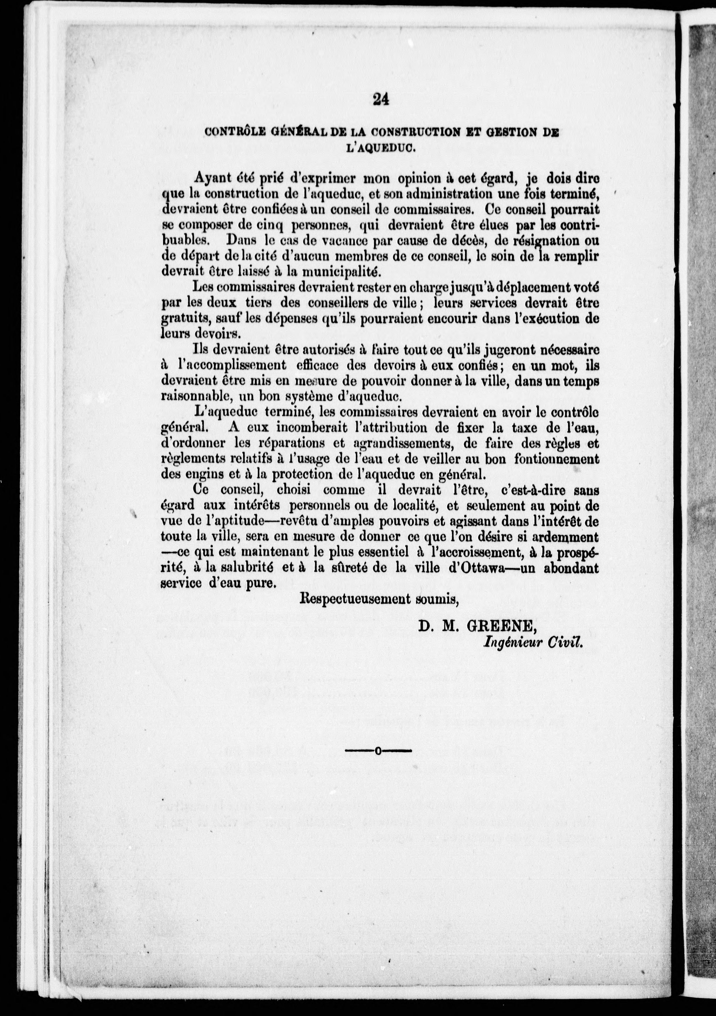 - Rapport de D. M. Greene, I. C., au Comité de l'aqueduc de la Corporation de la ville d'Ottawa.