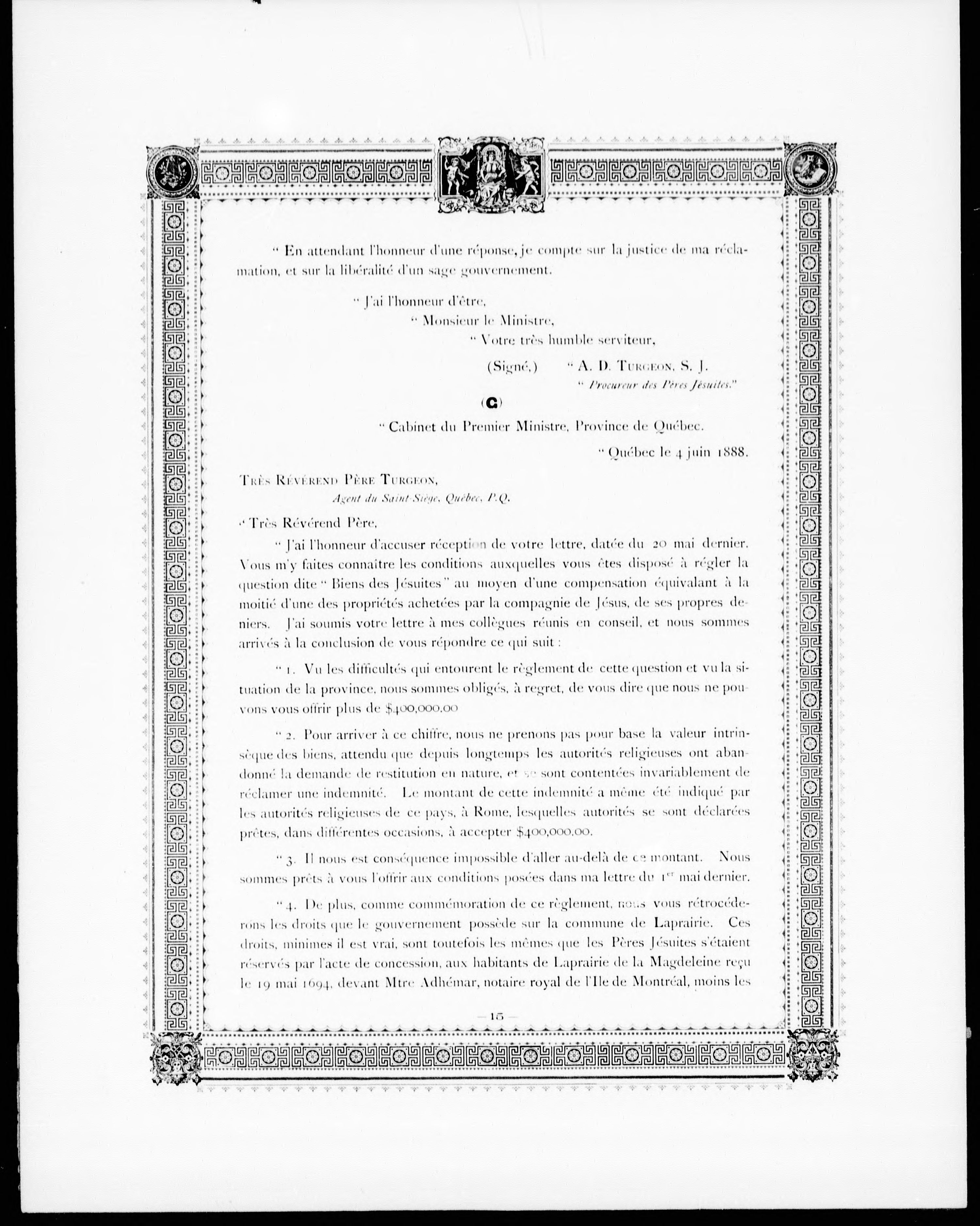 Documents relatifs au règlements de la question des biens des Jésuites : 1888-1890.