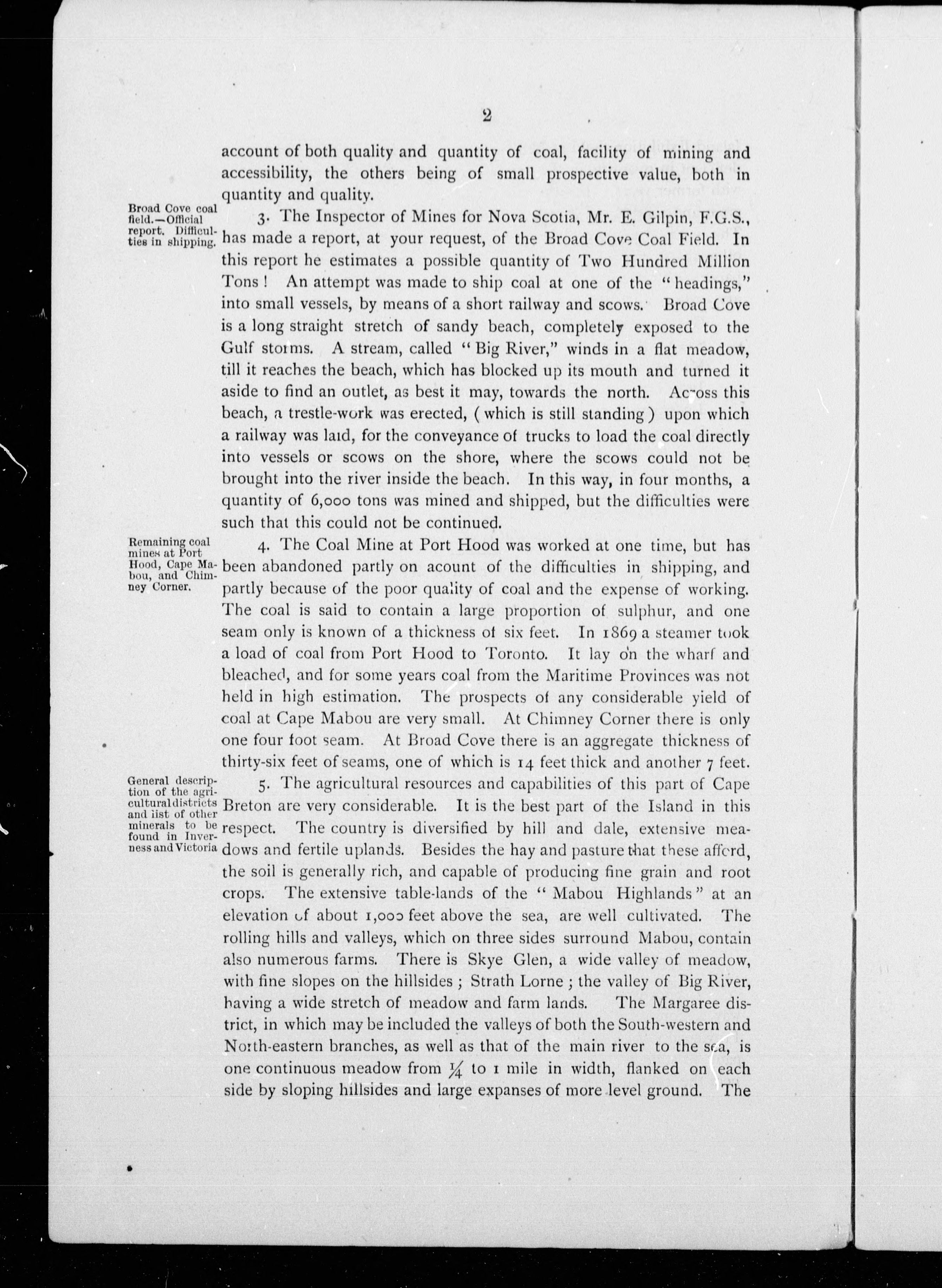 "Together with a description on the country, and of the Inverness and Richmond Railway Co's line; a comparison of the routes, and remarks on the best system of railway lines calculated to open up, in the shortest time, the agricultural and mineral resources of northern Cape Breton"