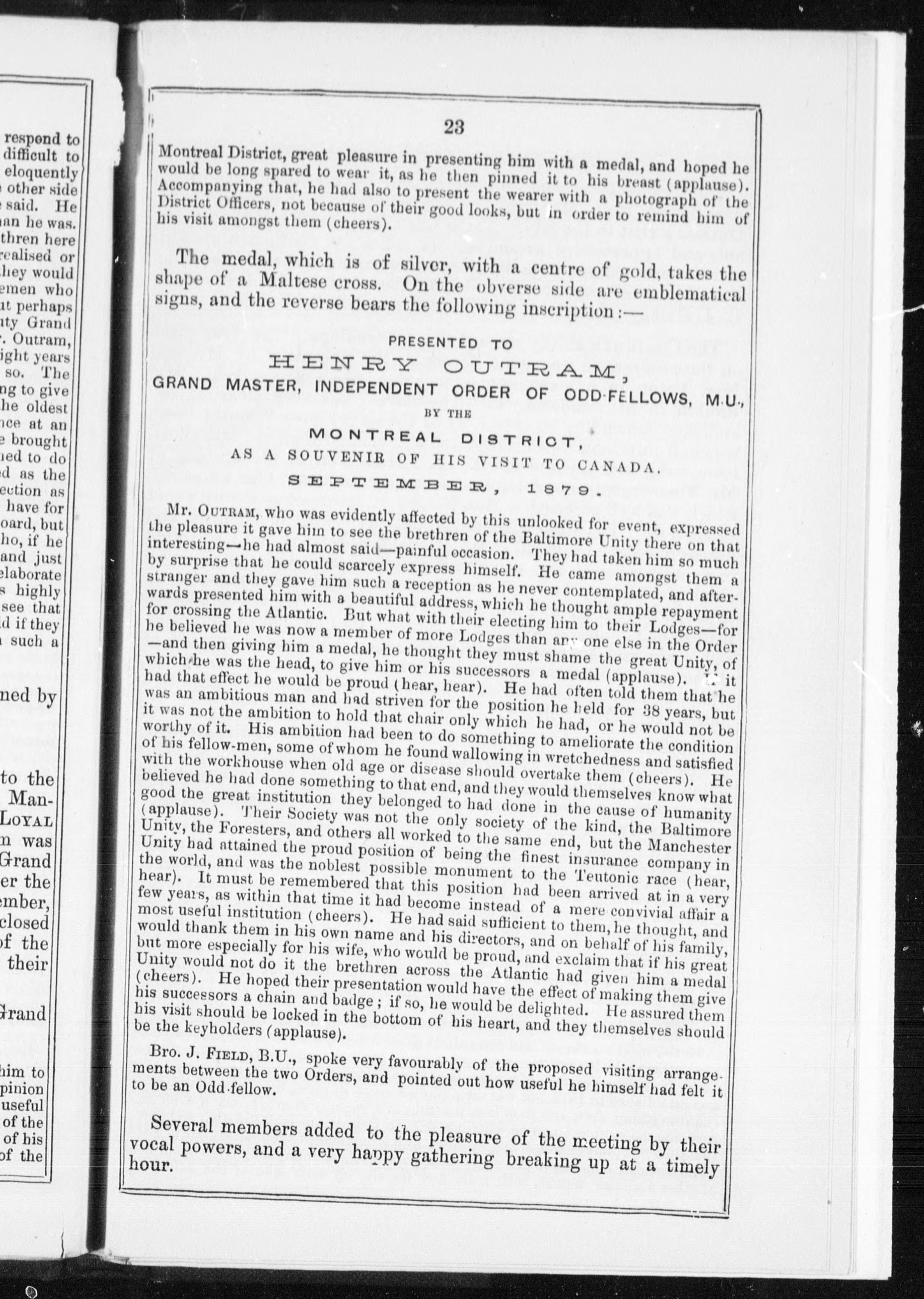 - Tour of the Grand master, Henry Outram, Esq., of Sheffield, in Canada & United States : with an account of his reception at Montreal, &c, presentations and banquets, principal speeches, a sermon on Odd-fellowship, by the Rev. Dr. Ussher of Montreal, incidents of the tour, personal impressions, &c.