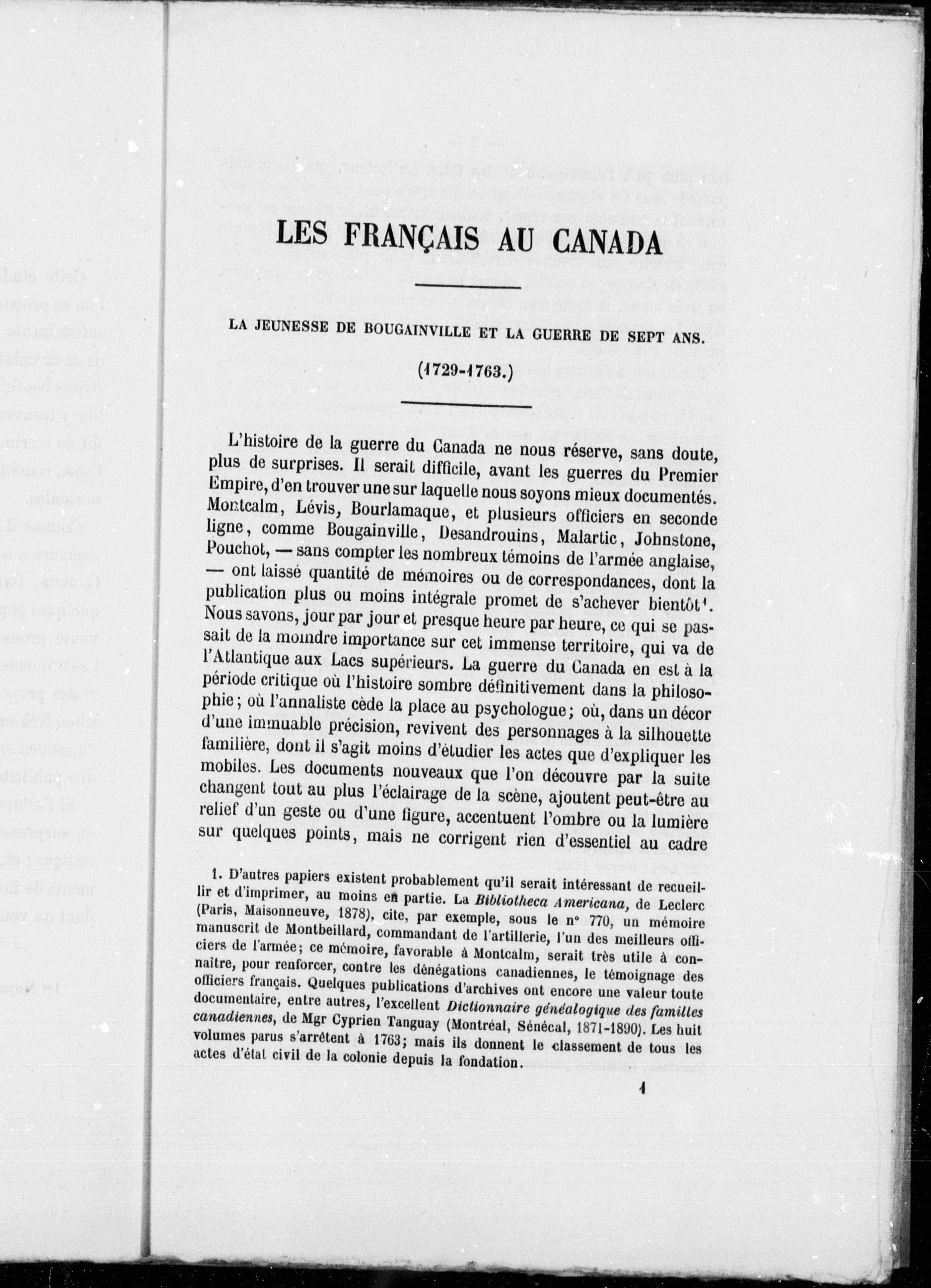 Réponse par un descendant de Bougainville aux propos fait contre les soldats français par l'abbé Casgrain dans ses oeuvres Montcalm et Lévis et Collection des manuscripts du maréchal de Lévis. Cf. Oxford companion to Canadian history and literature, pages 160.