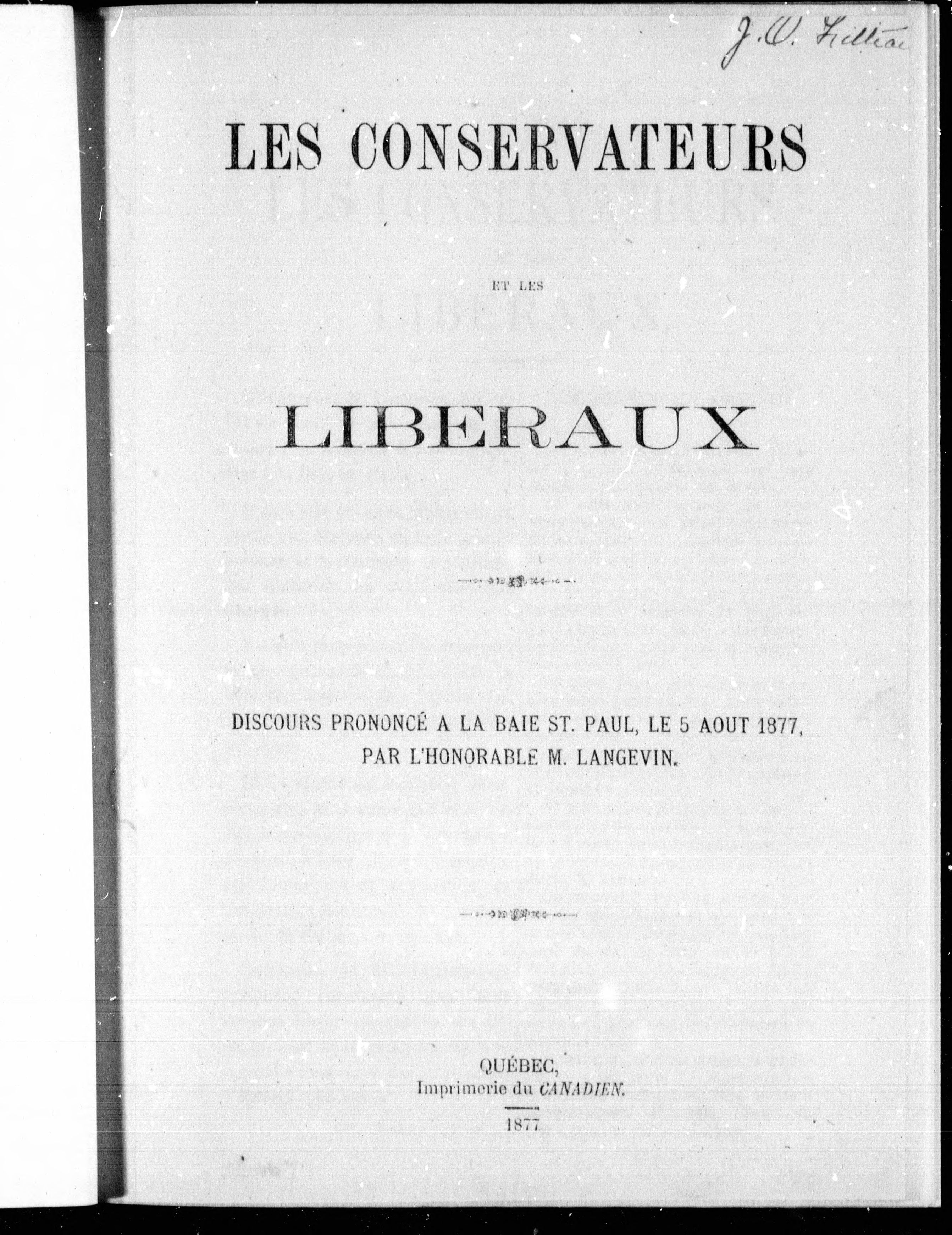 - Les conservateurs et les libéraux : discours prononcé à la Baie St. Paul, le 5 août 1877