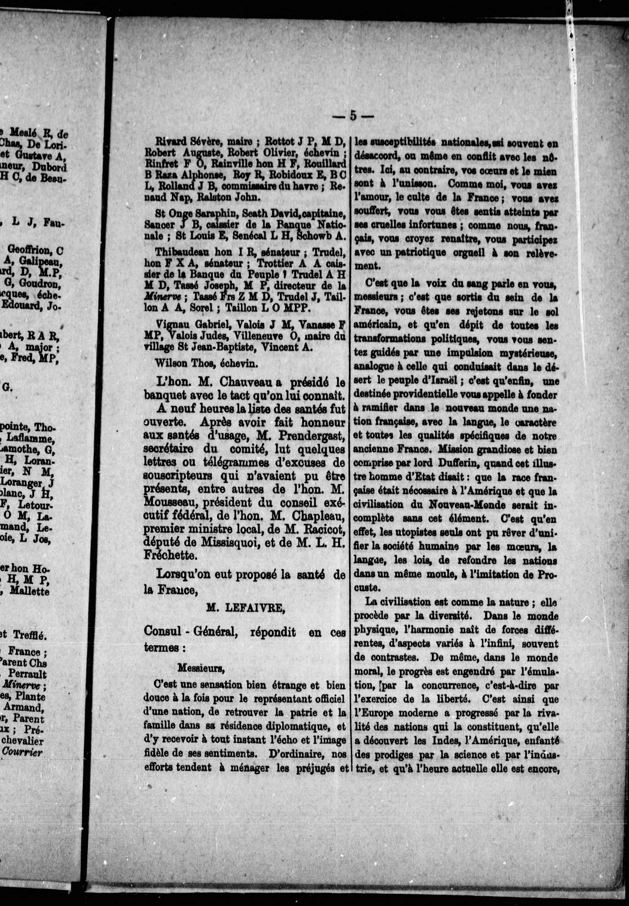 Argument: Le banquet fut donné en l'honneur des 3 délégués français, venus célébrer avec leurs collègues canadiens l'établissement du Crédit foncier franco-canadien.