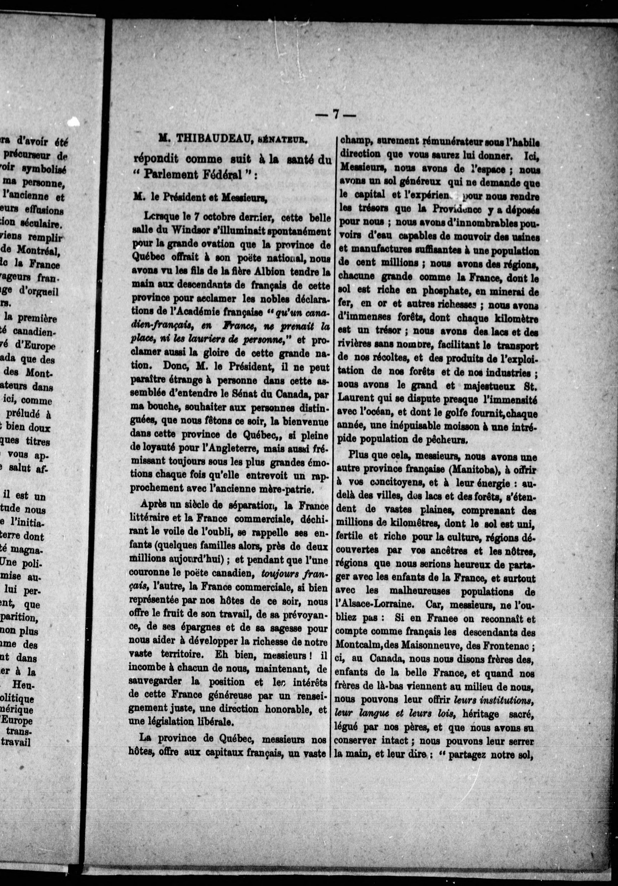 Argument: Le banquet fut donné en l'honneur des 3 délégués français, venus célébrer avec leurs collègues canadiens l'établissement du Crédit foncier franco-canadien.