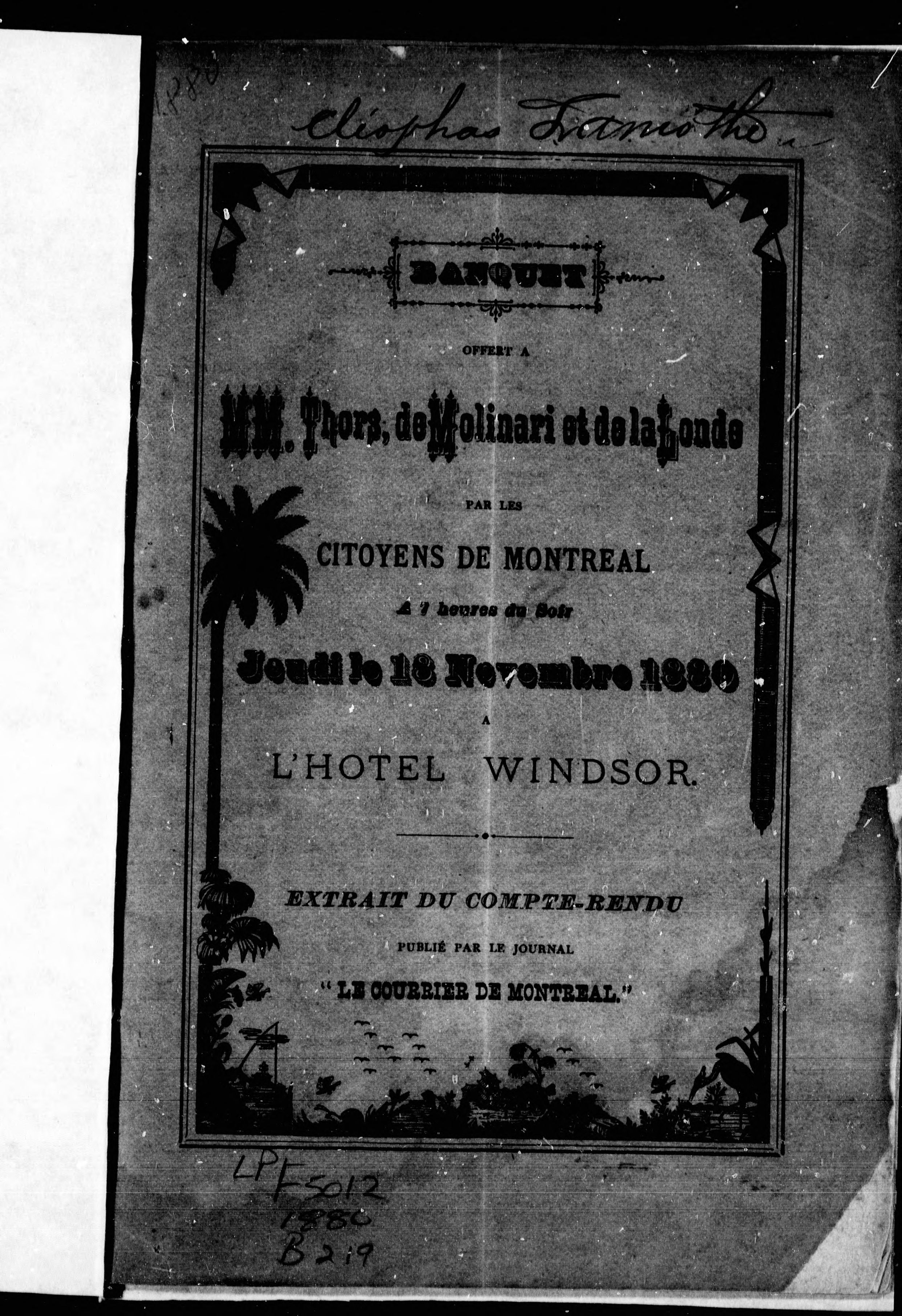 Banquet offert à MM. Thors, de Molinari et de la Londe par les citoyens de Montréal, à 7 heures du soir, jeudi le 18 novembre 1880, l'Hôtel Windsor.