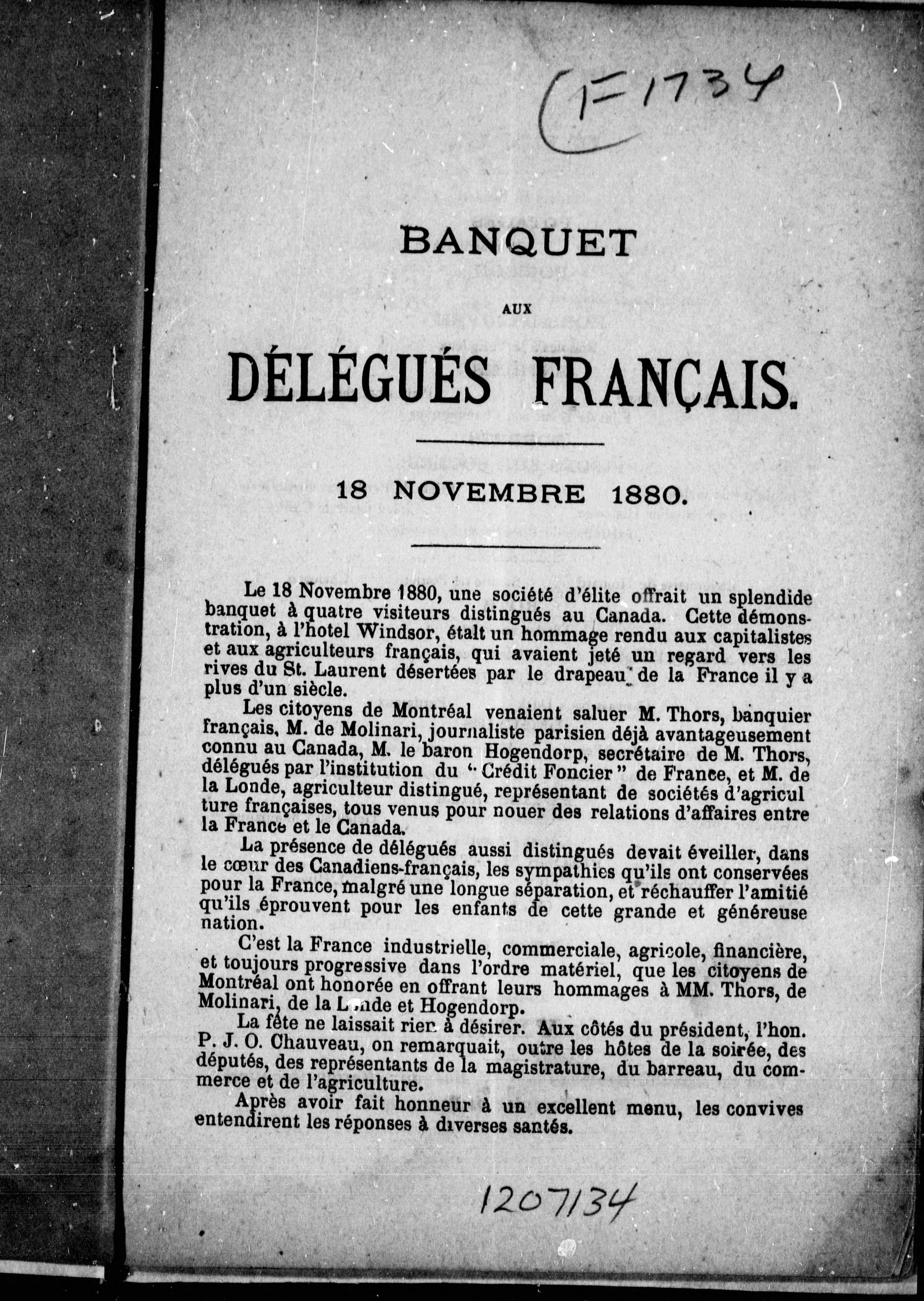 Banquet offert à MM. Thors, de Molinari et de la Londe par les citoyens de Montréal, à 7 heures du soir, jeudi le 18 novembre 1880, l'Hôtel Windsor.