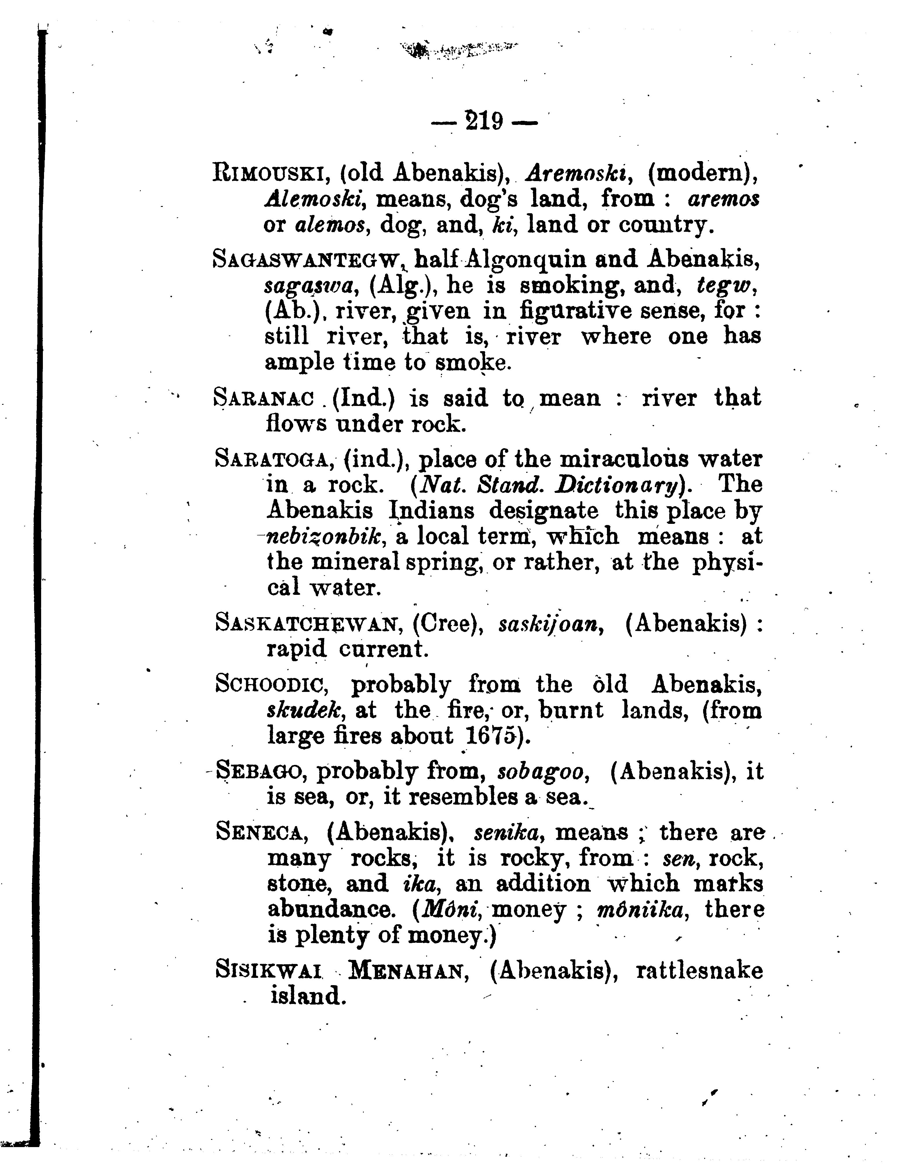 Added t.p. : New familiar Abenakis and English dialogues, the first vocabulary ever published in the Abenakis language, comprising : the Abenakis alphabet, the key to the pronunciaiton and many grammatical explanations, also synoptical illustrations showing the numerous modificaitons of the Abenakis verb, andc. : to which is added the etymology of Indian names of certain localities, rivers, lakes, andc., and c., original edition by Jos. Laurent, Abenakis, chief of the Indian village of St. Francis, P.Q. (Sozap LolóEKizitôgw), 1884.