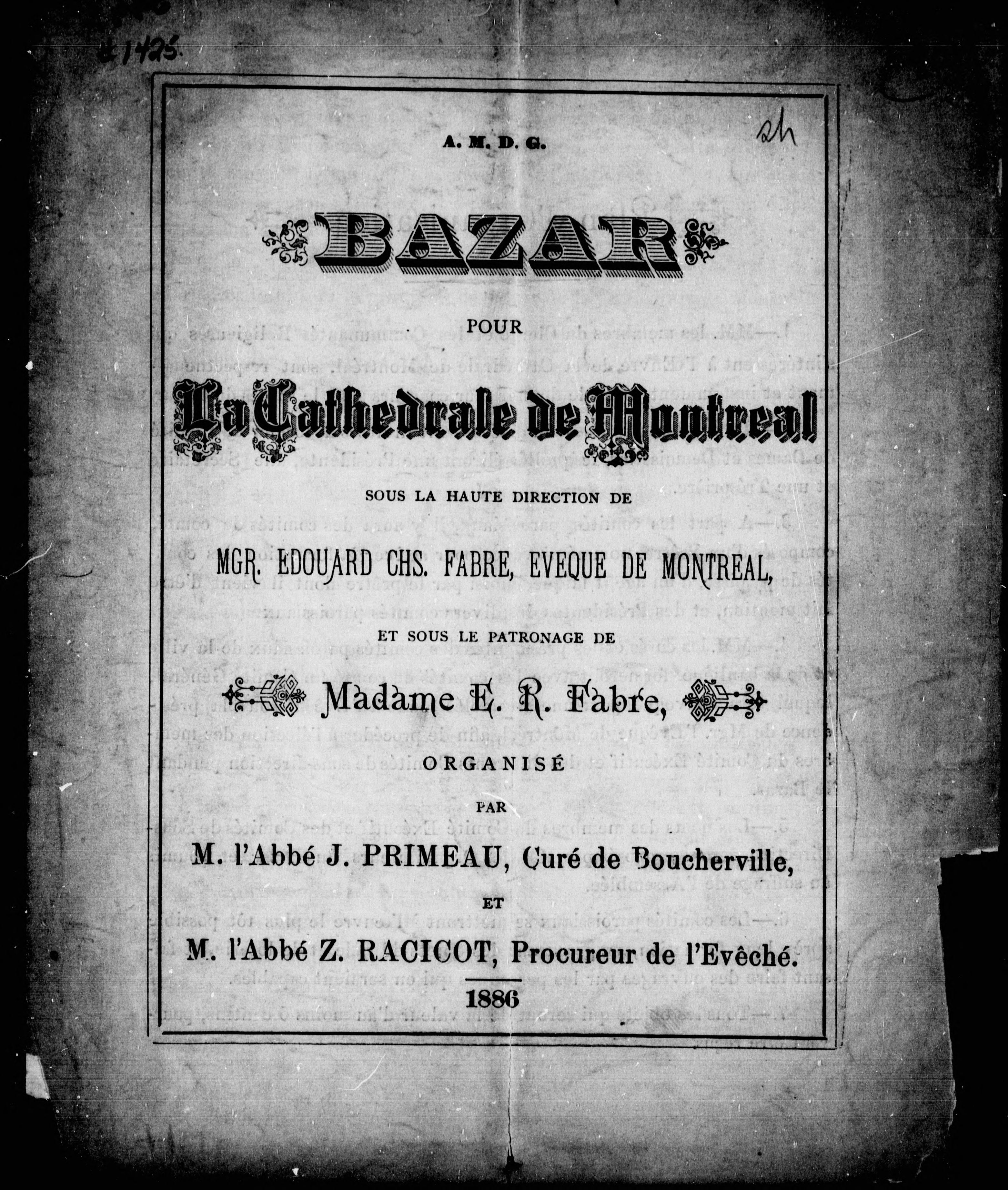 - Bazar pour la Cathédrale de Montréal : sous la haute direction de Mgr. Edouard Chs. Fabre, évêque de Montréal, et sous le patronage de madame E.R. Fabre, organisé par M. l'abbé J. Primeau, curé de Boucherville, et M. l'abbé Z. Racicot, procureur de l'évêché.