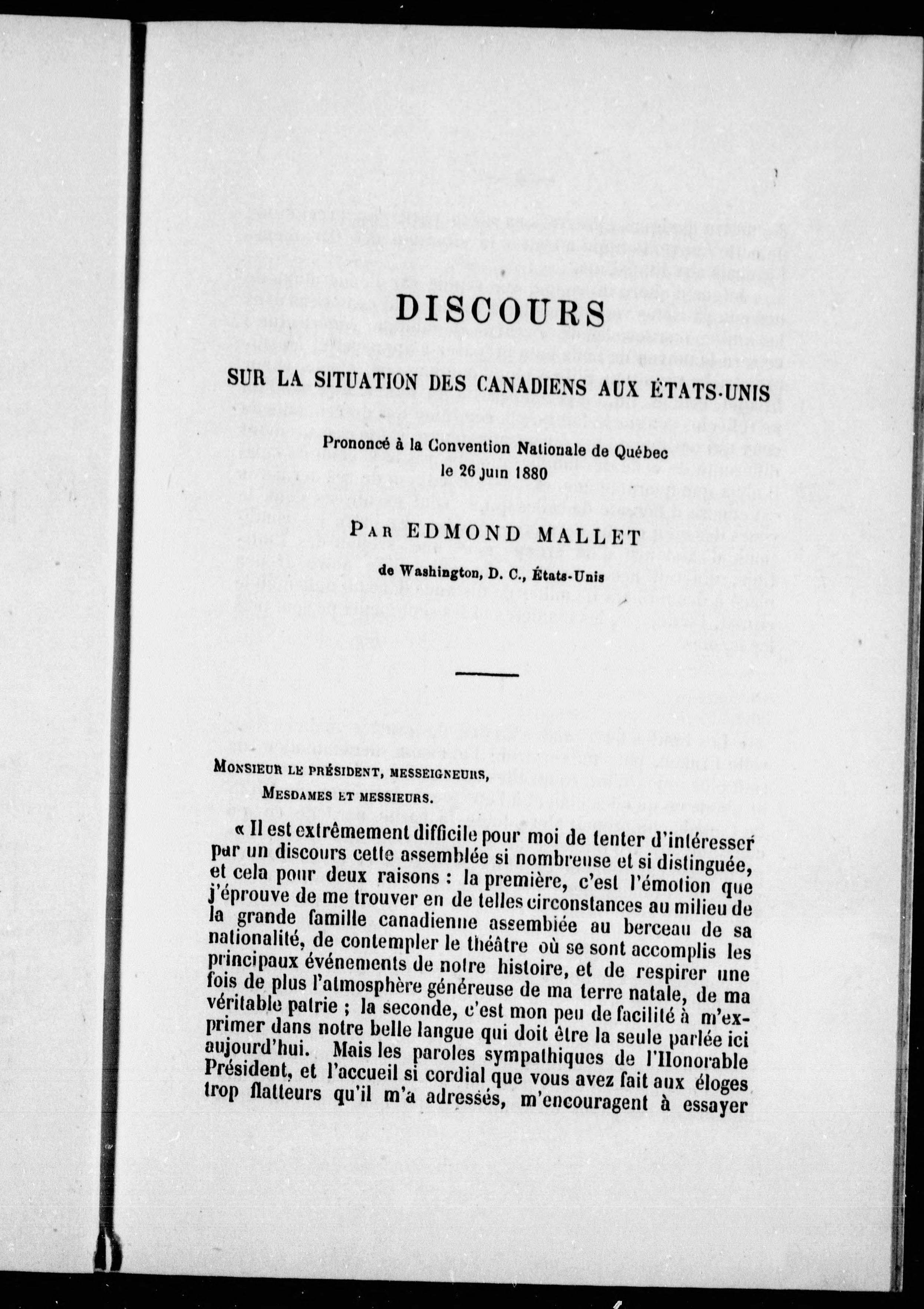 - Discours sur la situation des canadiens aux Etats-Unis : prononcé à la Convention nationale de Québec le 26 juin 1880