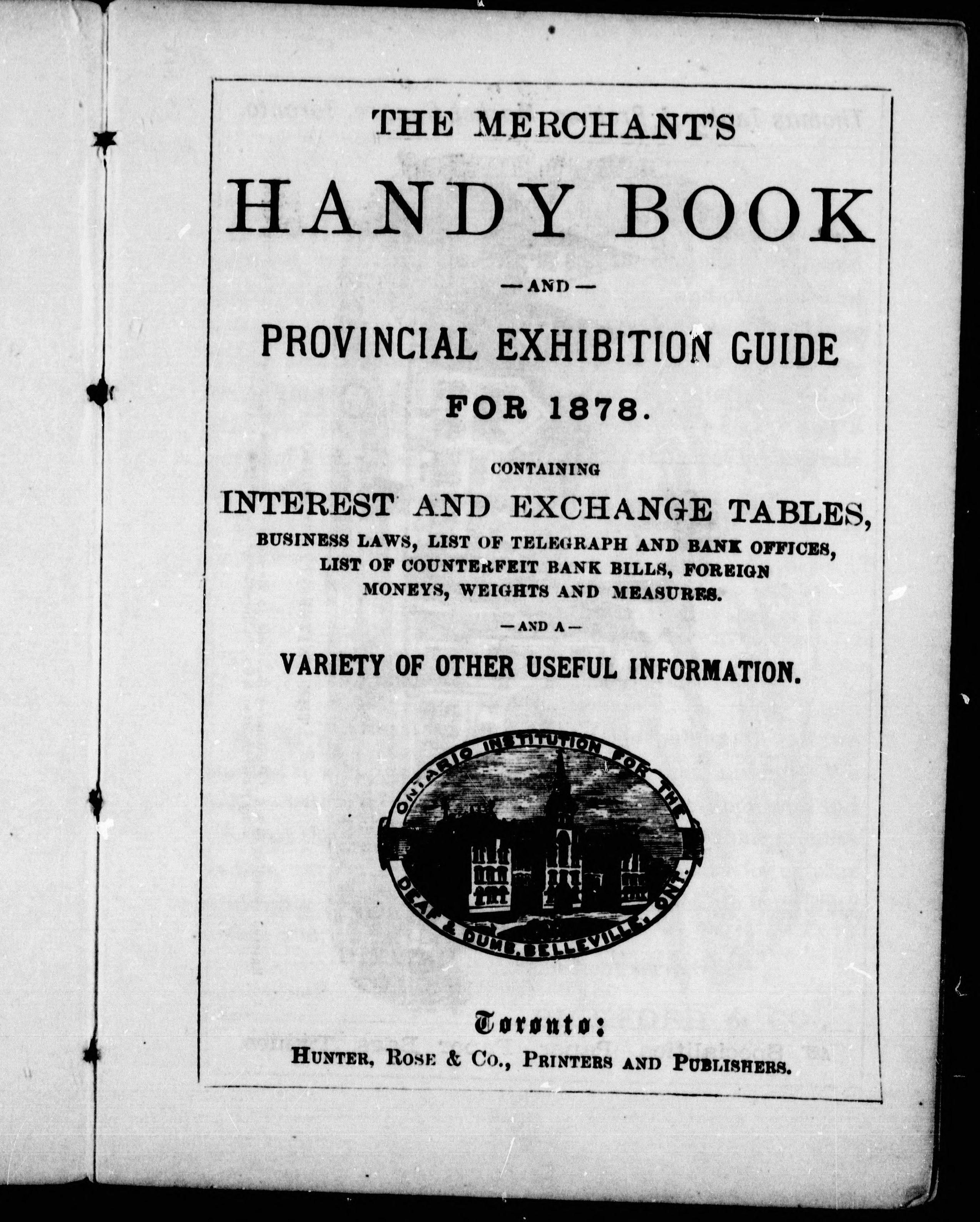 - The Merchant's handy book and provincial exhibition guide for 1878 : containing interest and exchange tables, business laws, list of telegraph and bank offices, list of counterfeit bank bills, foreign moneys, weights and measures and a variety of other useful information.