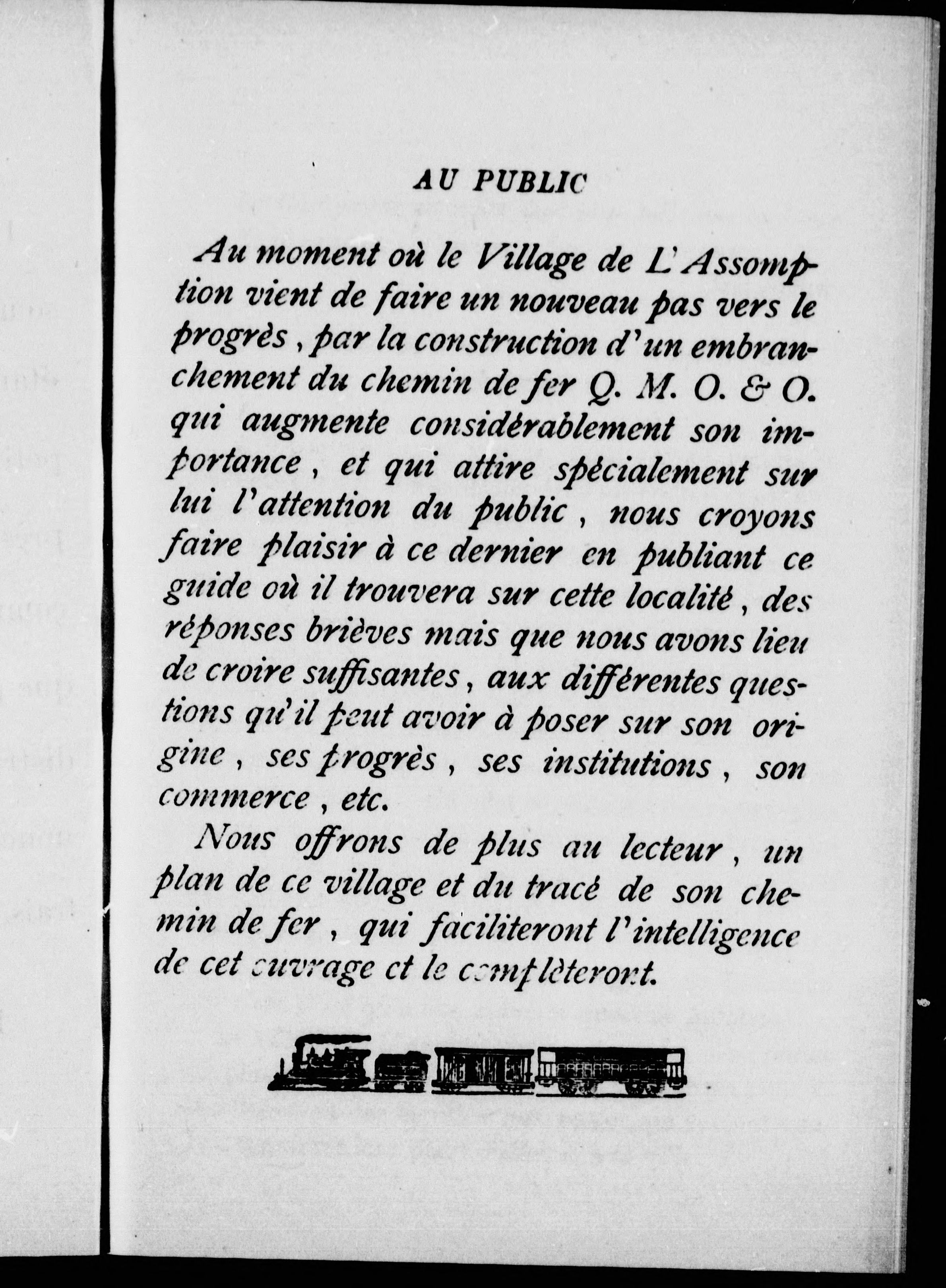 Guide de l'Assomption contenant les renseignements nécessaires aux gens de Montréal et d'ailleurs, qui veulent aller passer la saison d'été à la campagne, ou même y fixer leur famille tout en conservant leur place d'affaires à la ville /