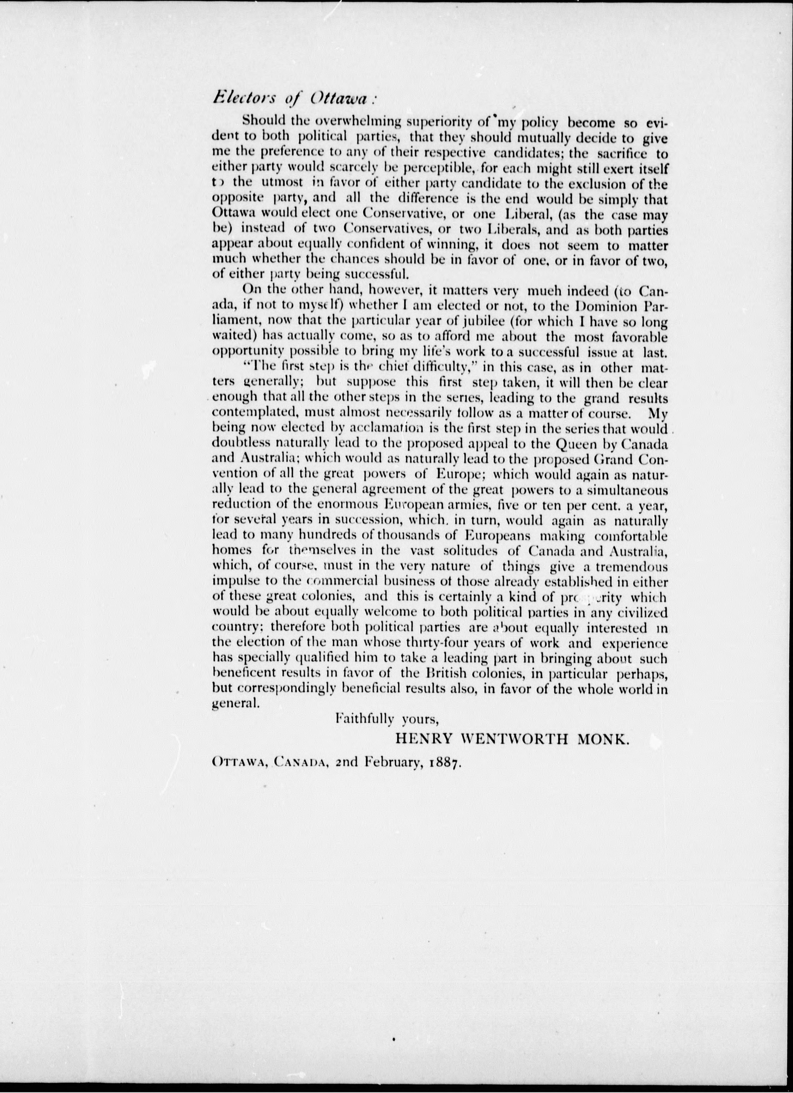Letters to the electors of Ottawa, signed: Henry Wentworth Monk.