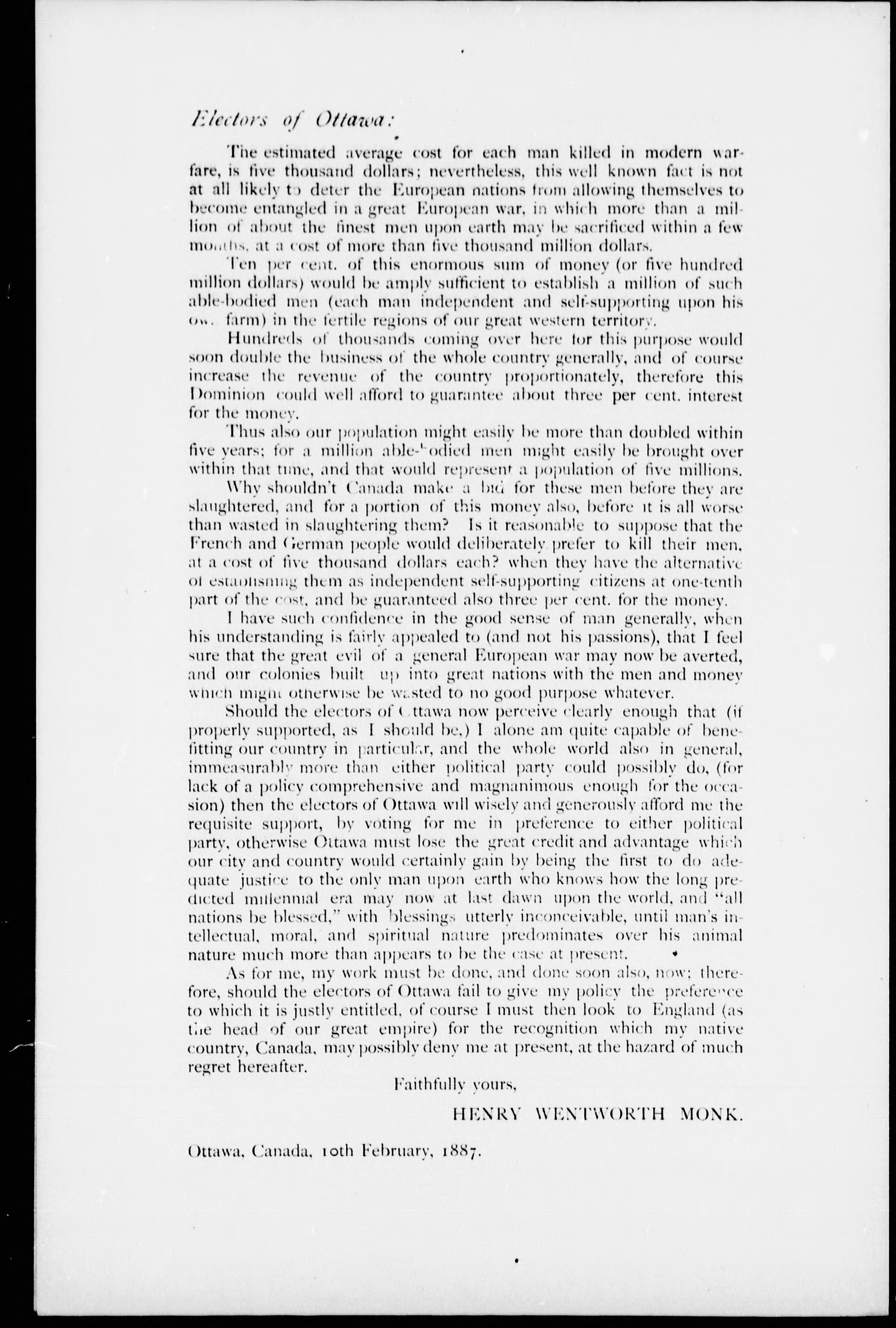 Letters to the electors of Ottawa, signed: Henry Wentworth Monk.