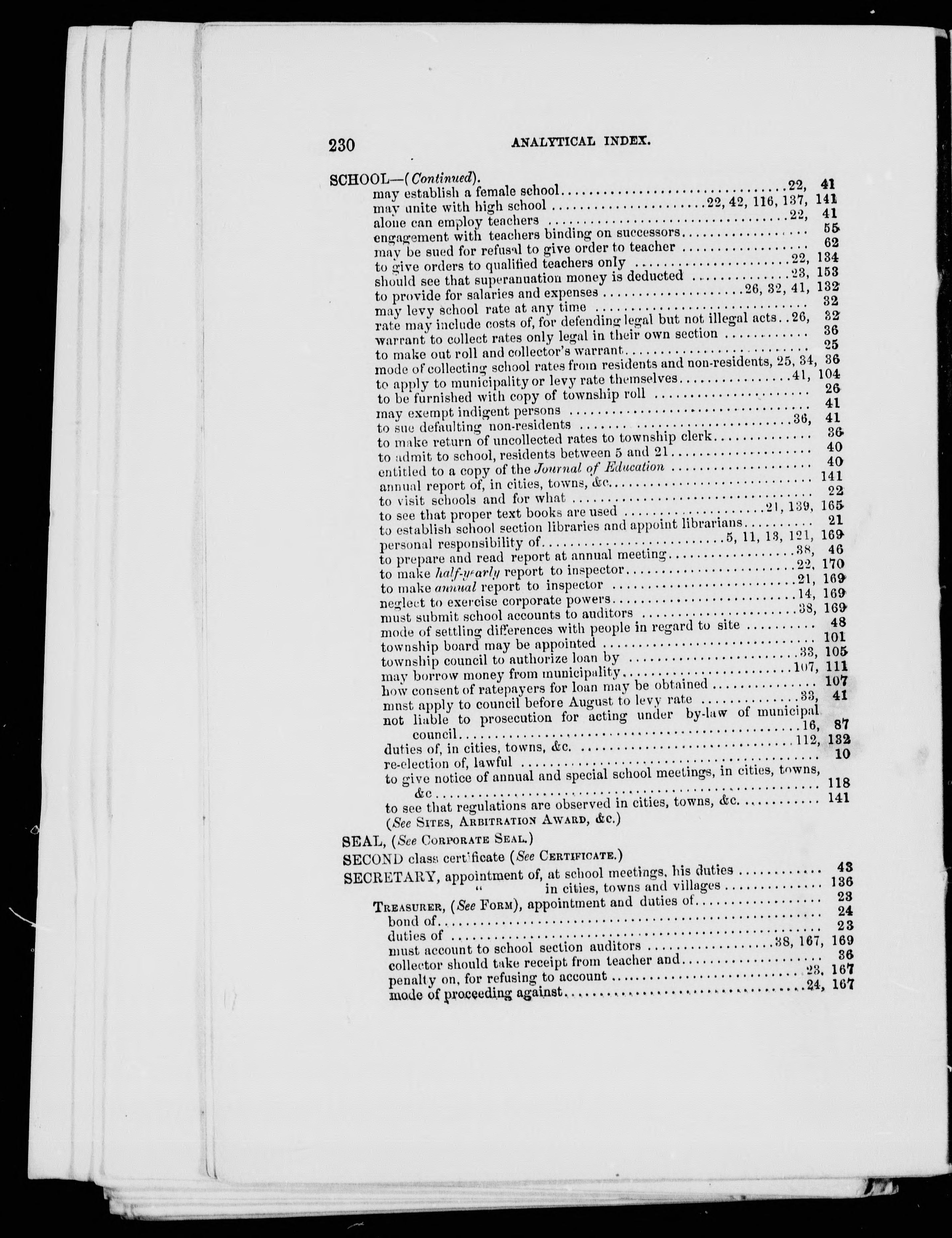 - The school law, official regulations, and decisions of the superior courts : relating to township, county, city, town and incorporated village, municipal concils, school section boundaries; city, town and village, public school boards, arbitrations and awards, public school inspectors, boards of examiners, chief superintendent and Council of Public Instruction; also, the acts relating to Roman Catholic, Protestant, and coloured separate schools, with a copious index to parts I and II, being the substance of lectures to normal school students