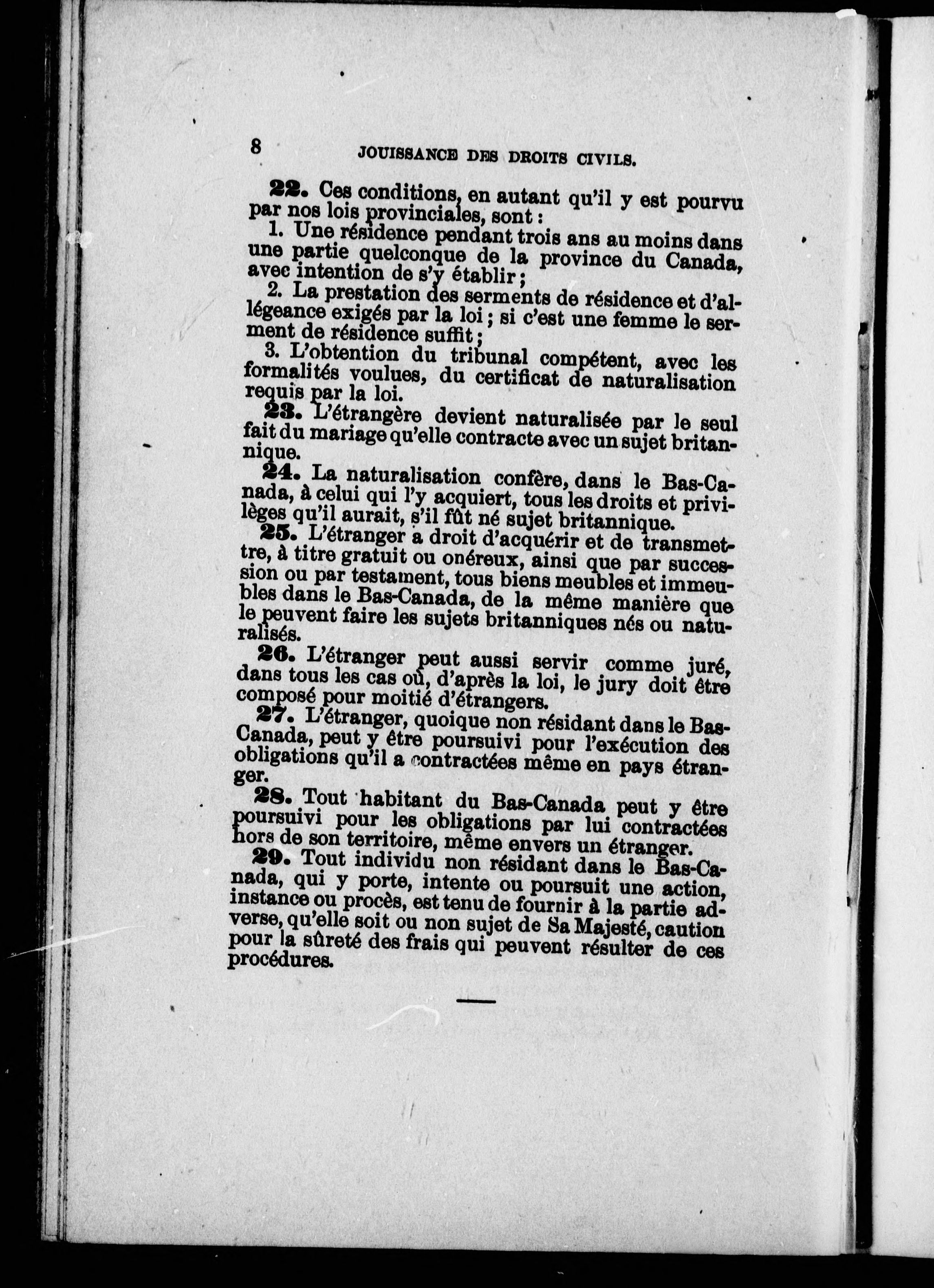 Le Code civil du Bas-Canada (en force depuis le 1er août 1866) :