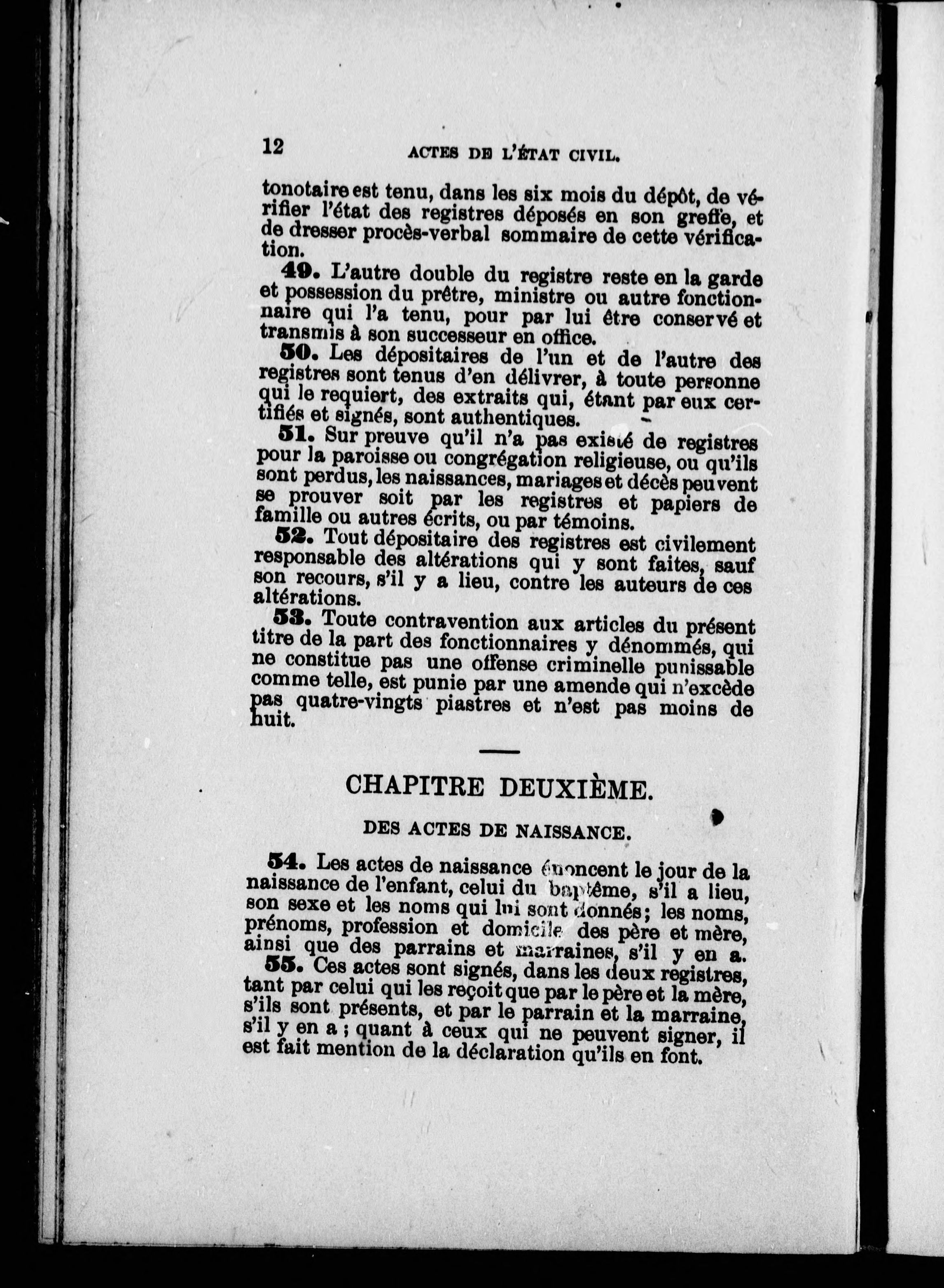 Le Code civil du Bas-Canada (en force depuis le 1er août 1866) :