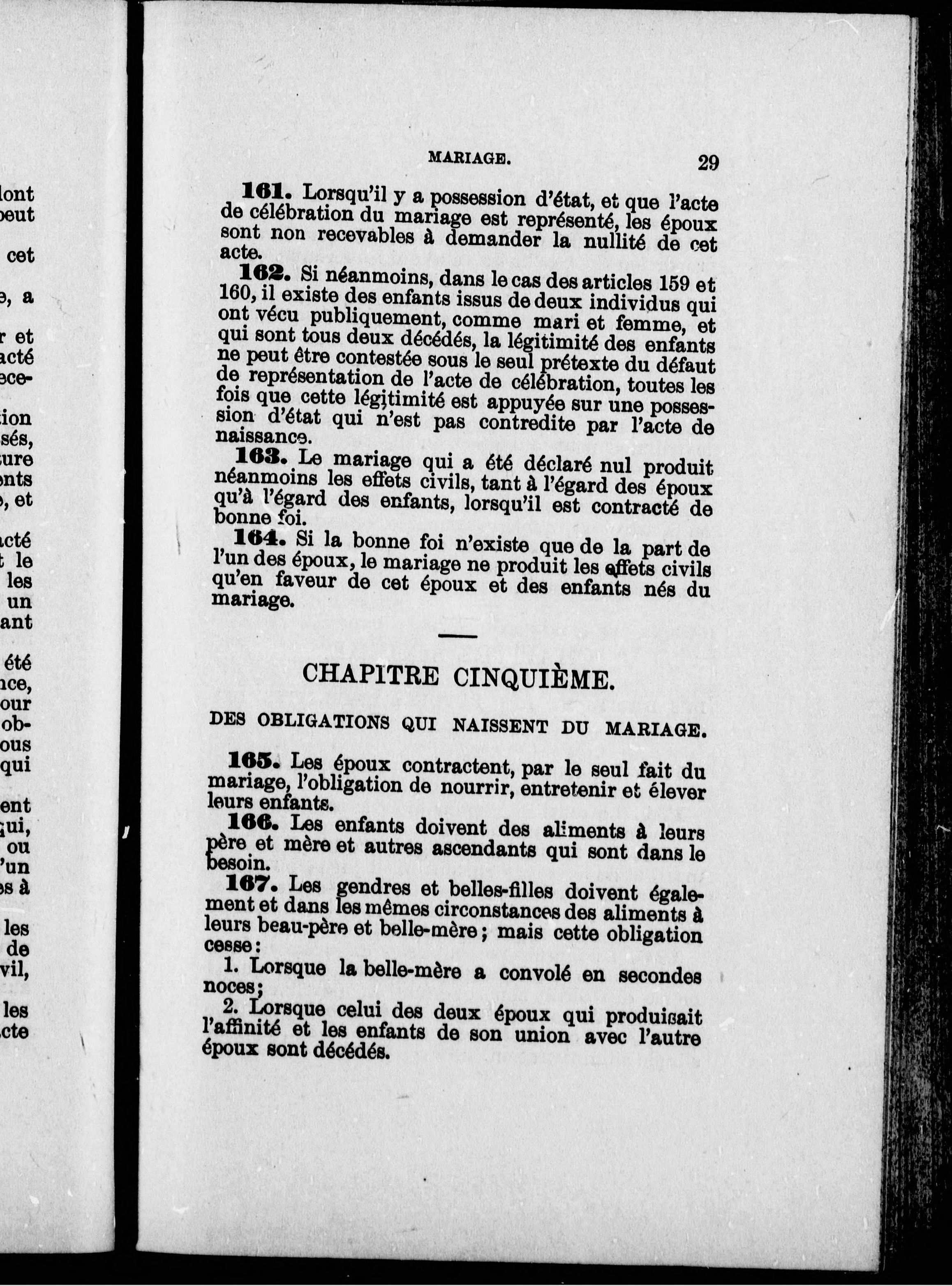 Le Code civil du Bas-Canada (en force depuis le 1er août 1866) :