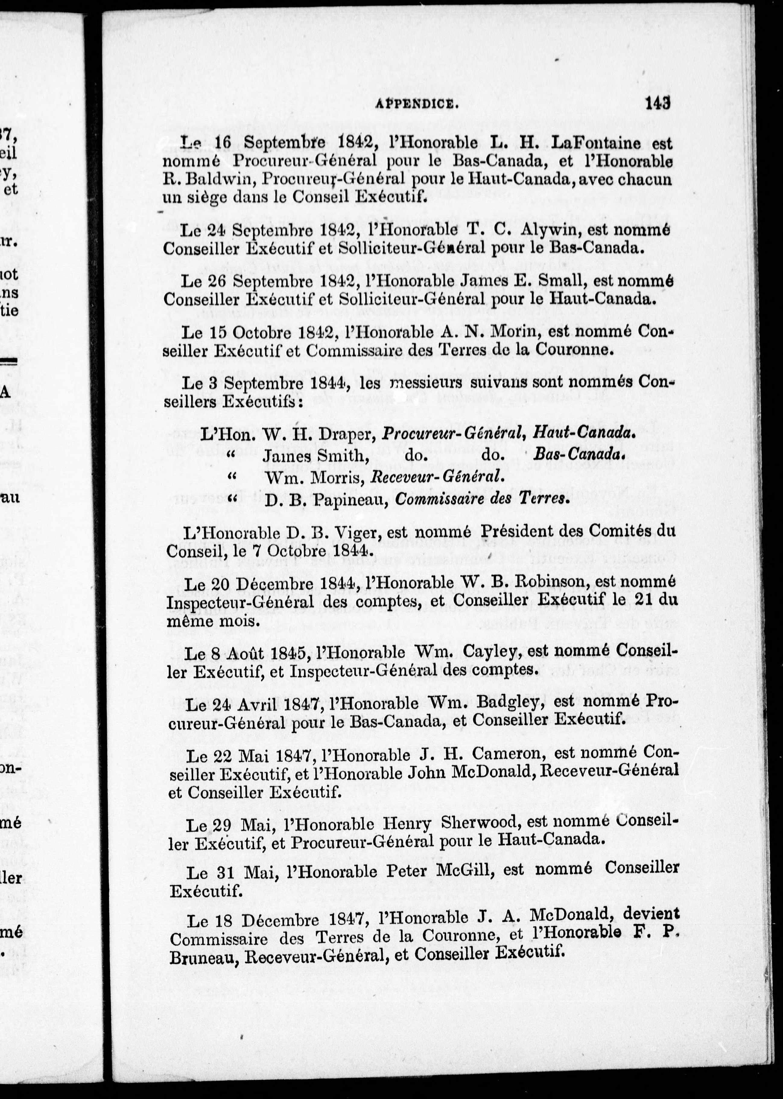 Avec un appendice contenant les dispositions encore en force des capitulations, du traitéde paix, et des actes constitutionnels du Canada; le texte de l'acte d'union des deux provinces et les amendemens qu'il a subis depuis sa passation; ainsi que divers autres renseignemens d'utilité générale. Aussi, plusieurs tableaux présentant une liste complète des membres de l'Assemblée législative, du Conseil législatif, et du Conseil exécutif du Bas-Canada, depuis l'établissement du gouvernement repré sentatif en ce pays jusqu'à nos jours."