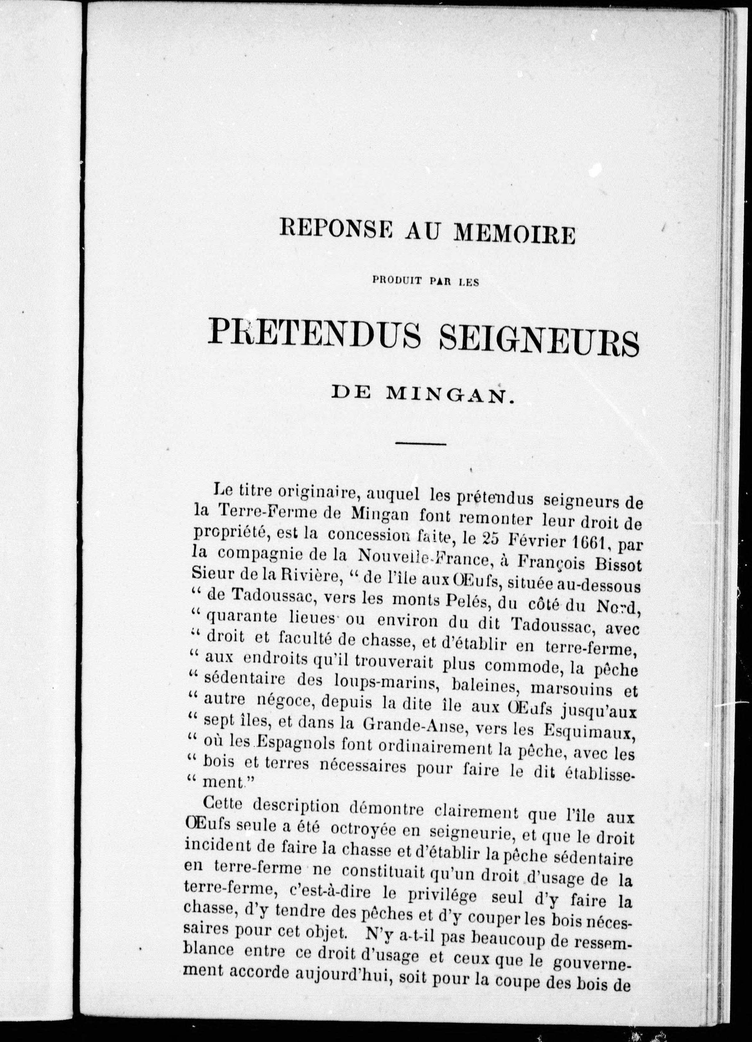 - Réponse au mémoire produit par les prétendus seigneurs de Mingan