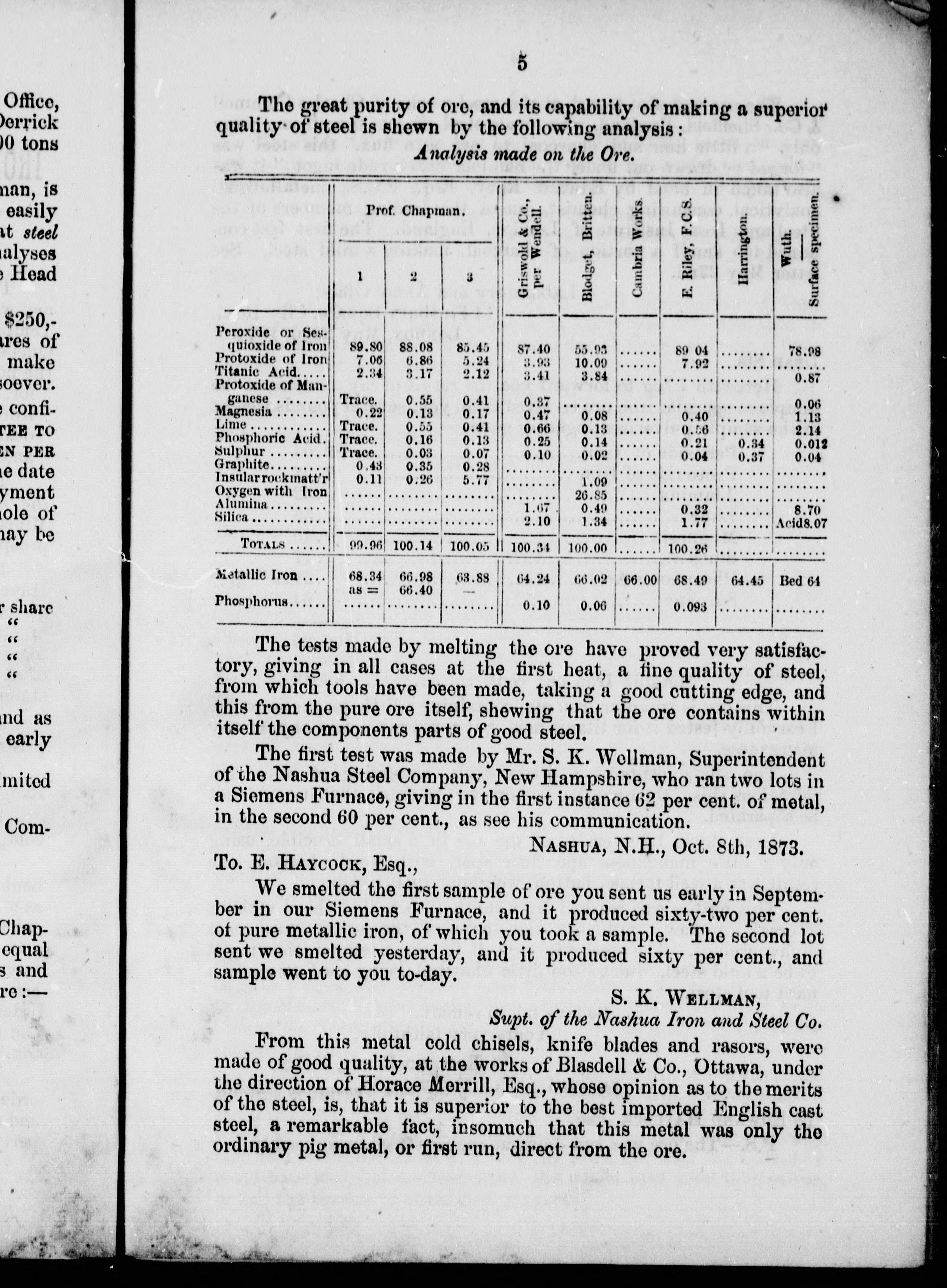 With: Supplementary report on the Haycock Iron Location, by E.J. Chapman and Bill of incorporation, with amendment.