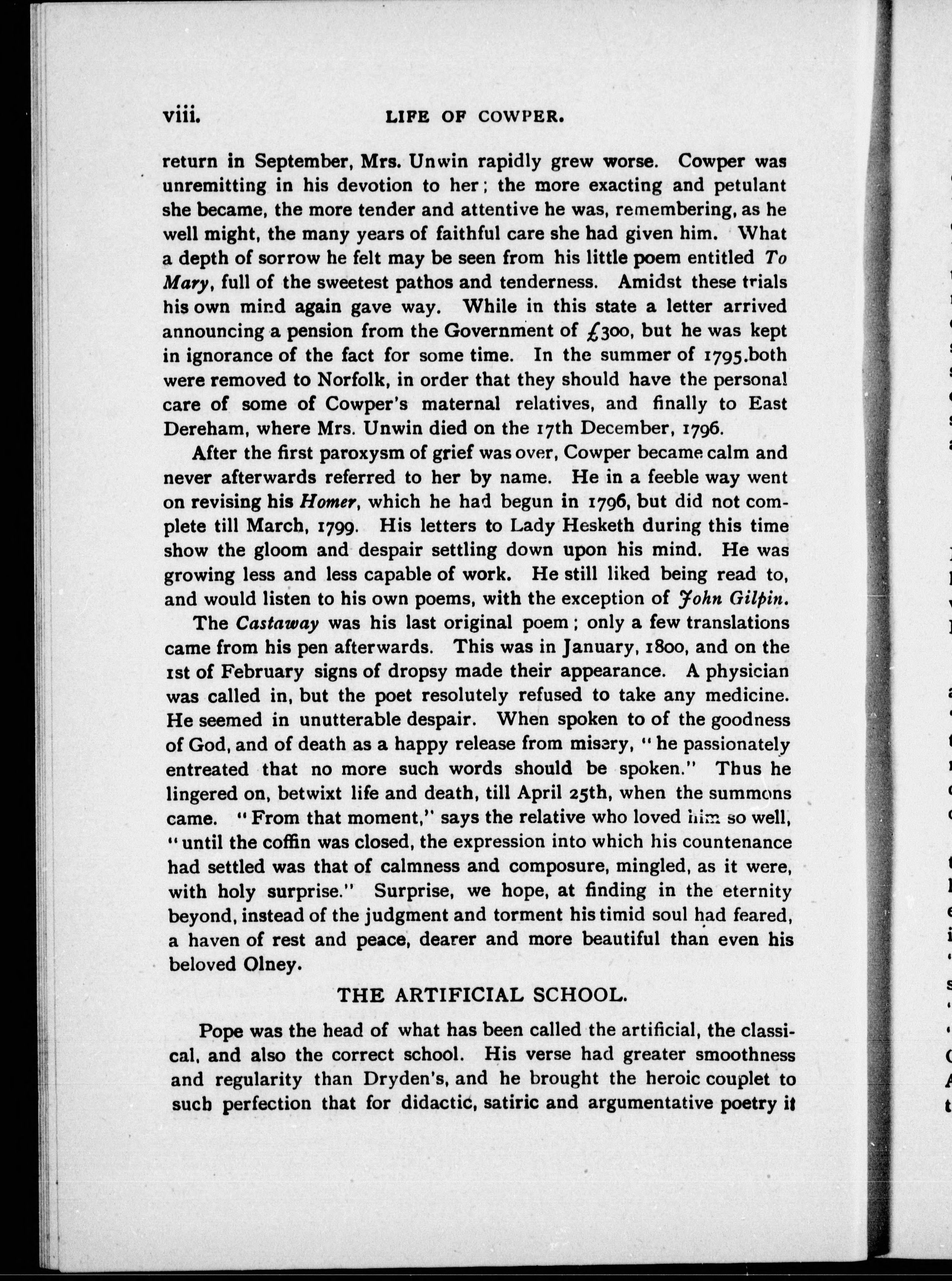 Cowper's Task, books III & IV, The Garden and The Winter Evening ; and Colerage's Friend, essays III-VI, Life of Sir Alexander Ball