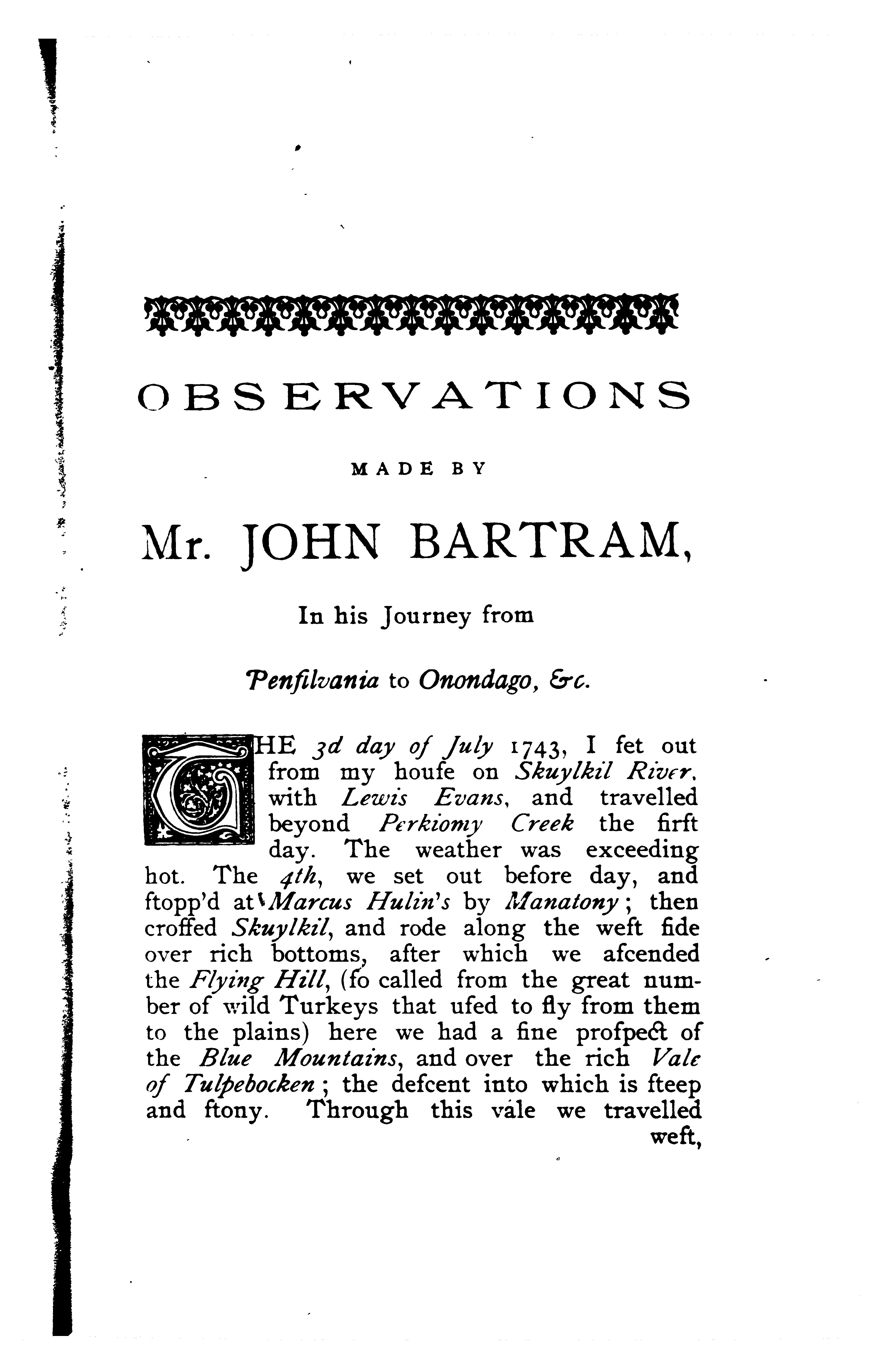 - Observations on the inhabitants, climate, soil, rivers, productions, animals, and other matters worthy of notice made by Mr. John Bartram, in his travels from Pensilvania [sic] to Onondago, Oswego and the Lake Ontario, in Canada : to which is annex'd a curious account of the cataracts at Niagara by Mr. Peter Kalm, a Swedish gentleman who travelled there.