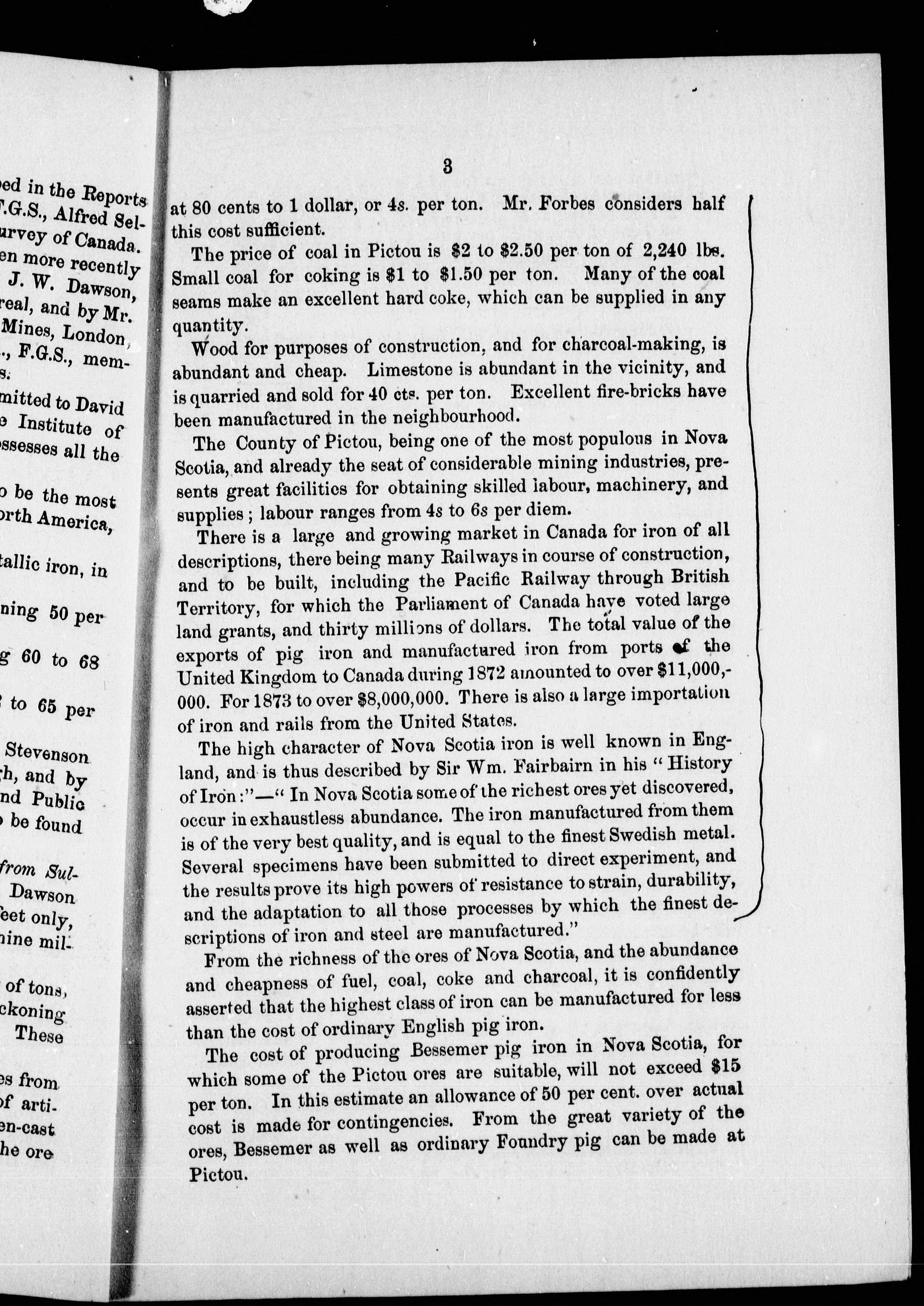 The Pictou Coal and Iron Co., Nova Scotia, Dominion of Canada : reports by Dr. W.J. Dawson, F.R.S., G.M. Dawson, associate of the School of Mines, London, Walter Shanly, Esq., Kennett Blackwell, Esq. and Edwin Gilpin, Esq., M.A., F.G.S. mining engineer, together with estimates and tables of analysis.