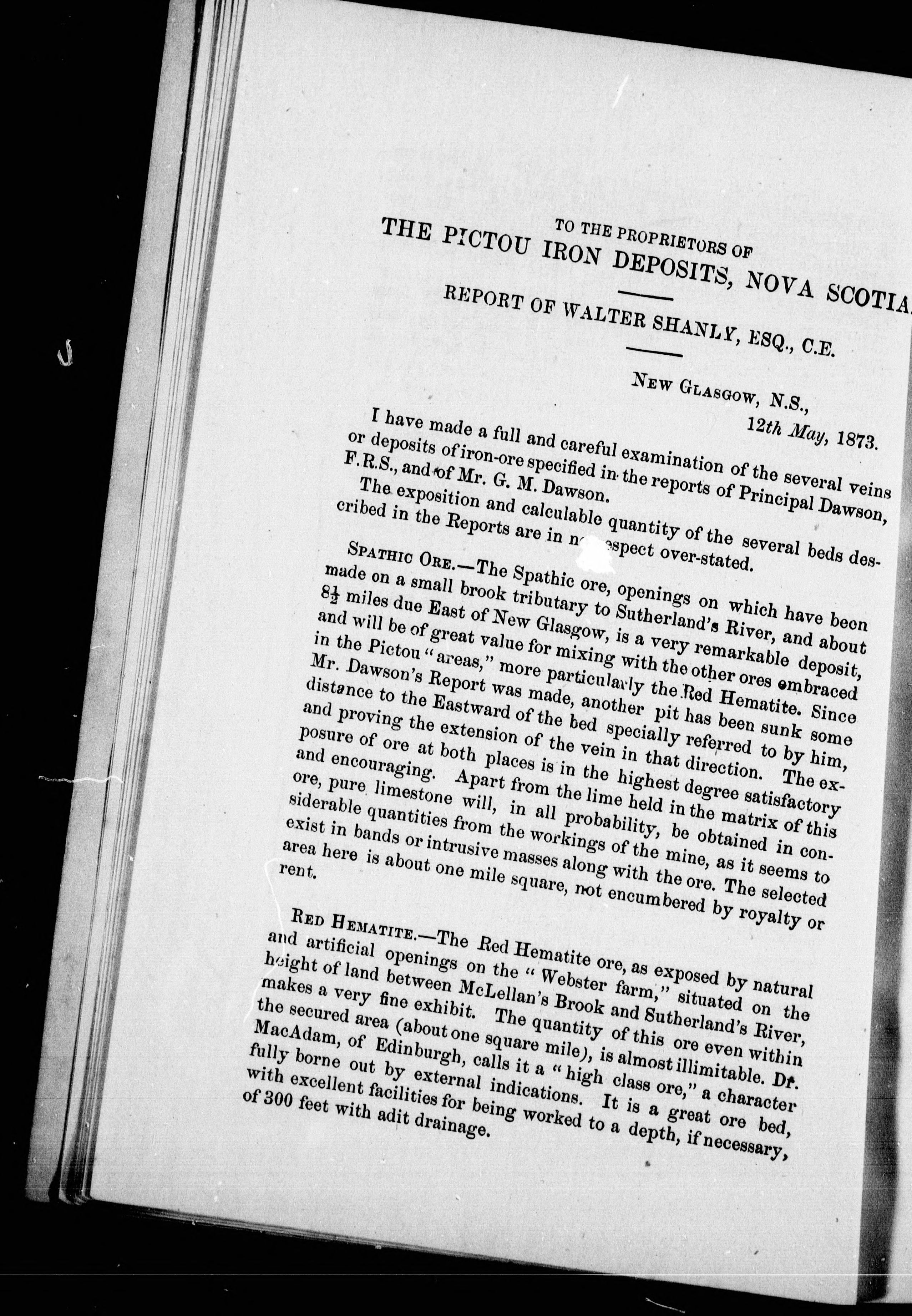 The Pictou Coal and Iron Co., Nova Scotia, Dominion of Canada : reports by Dr. W.J. Dawson, F.R.S., G.M. Dawson, associate of the School of Mines, London, Walter Shanly, Esq., Kennett Blackwell, Esq. and Edwin Gilpin, Esq., M.A., F.G.S. mining engineer, together with estimates and tables of analysis.