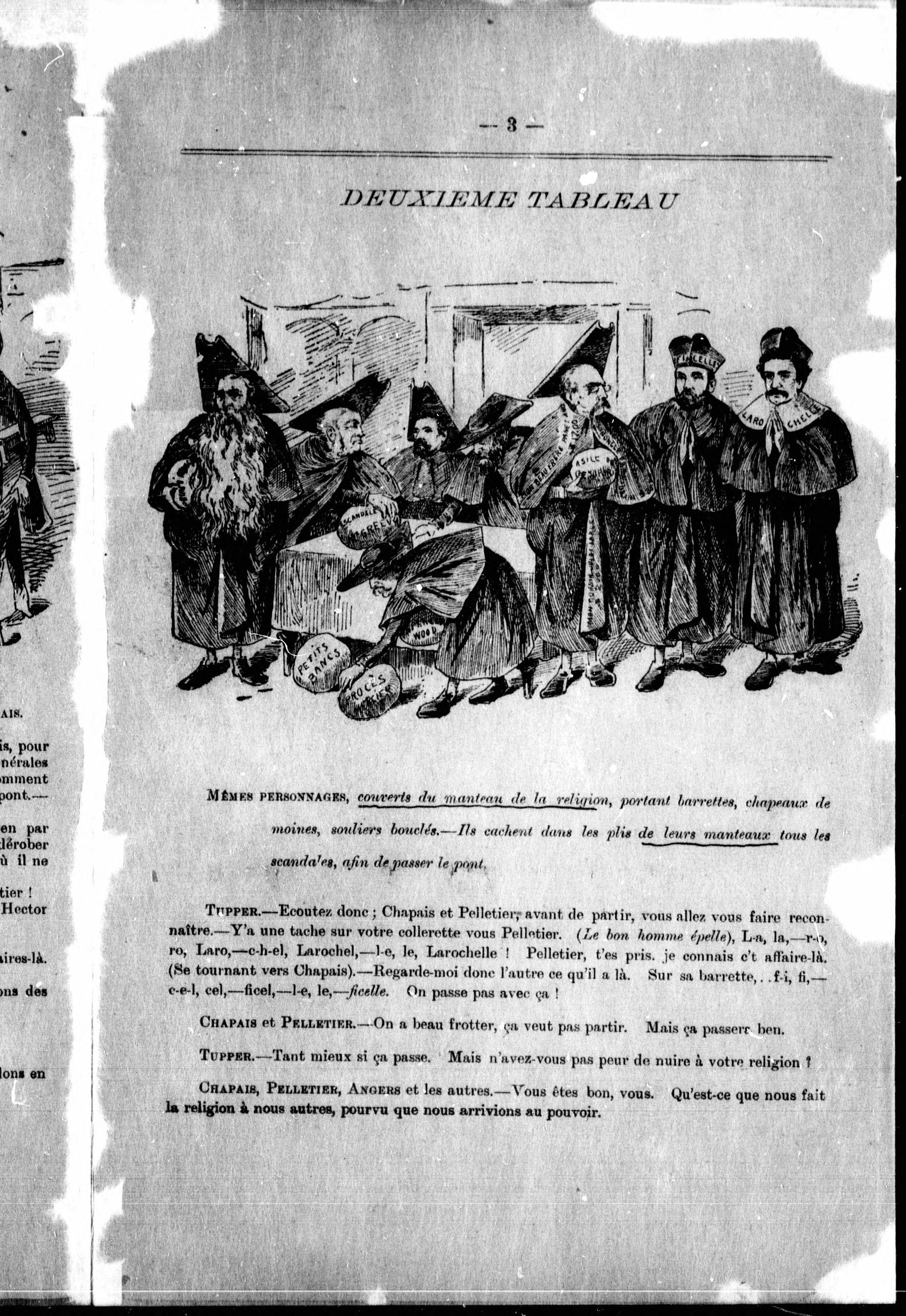 - Un Drame en huit tableaux, à l'eau des hypocrites : le peuple découvre de que les bleus cachent sous le manteau de la religion, vive Laurier.