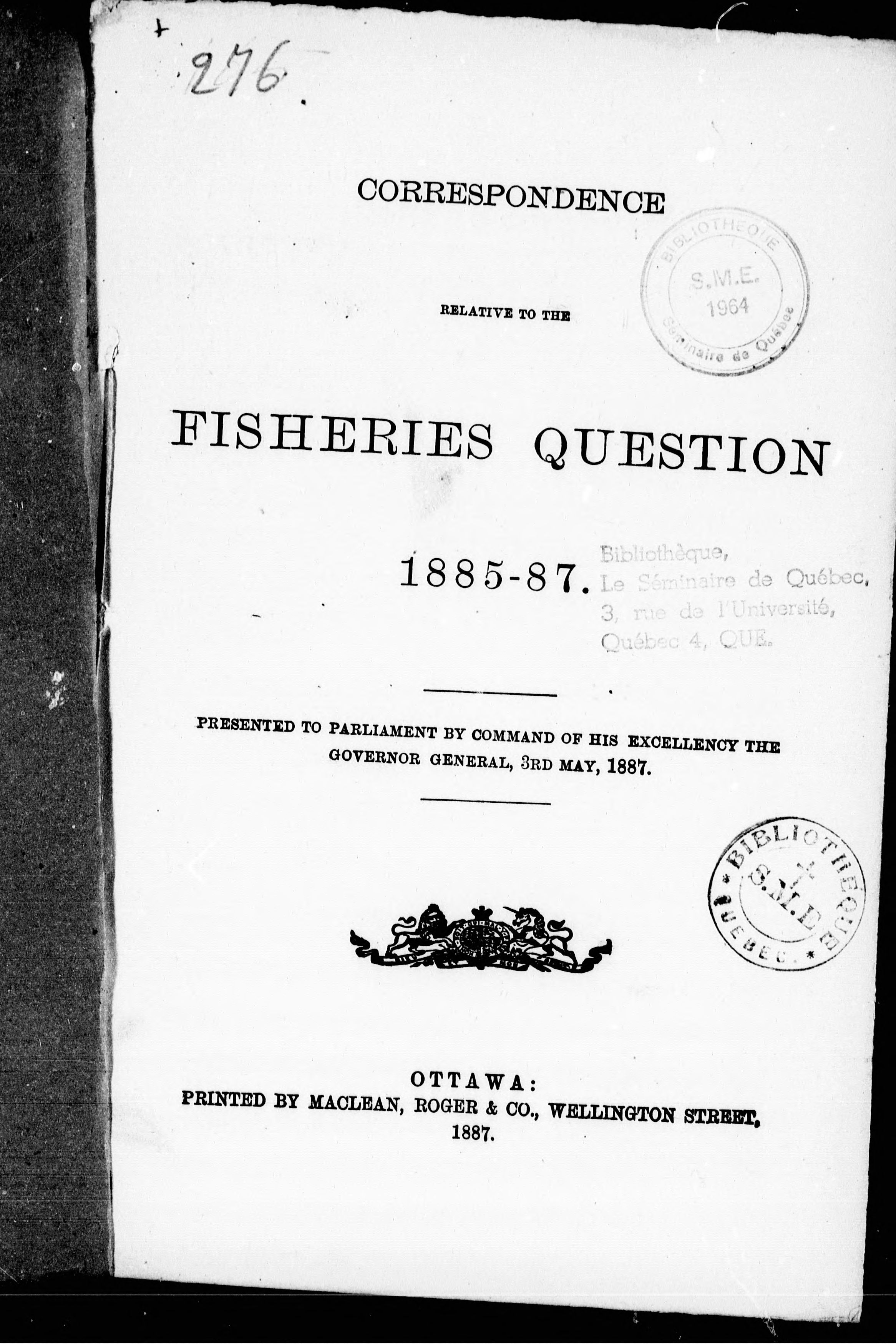 - Correspondence relative to the fisheries question, 1885-87 : presented to Parliament by command of His Excellency the Governor General, 3rd May, 1887.
