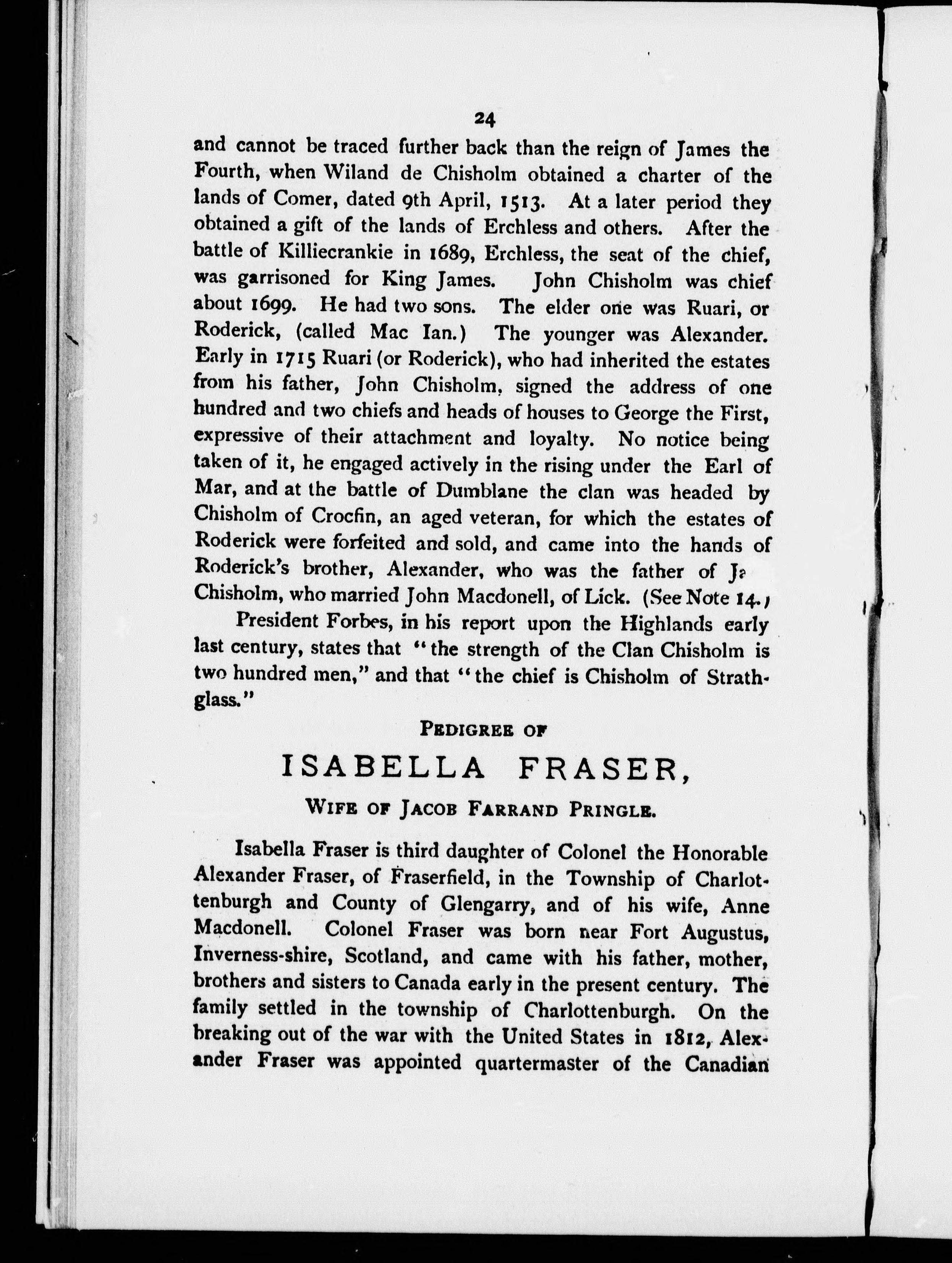 The genealogy of Jacob Farrand Pringle and his wife Isabella Fraser Pringle.