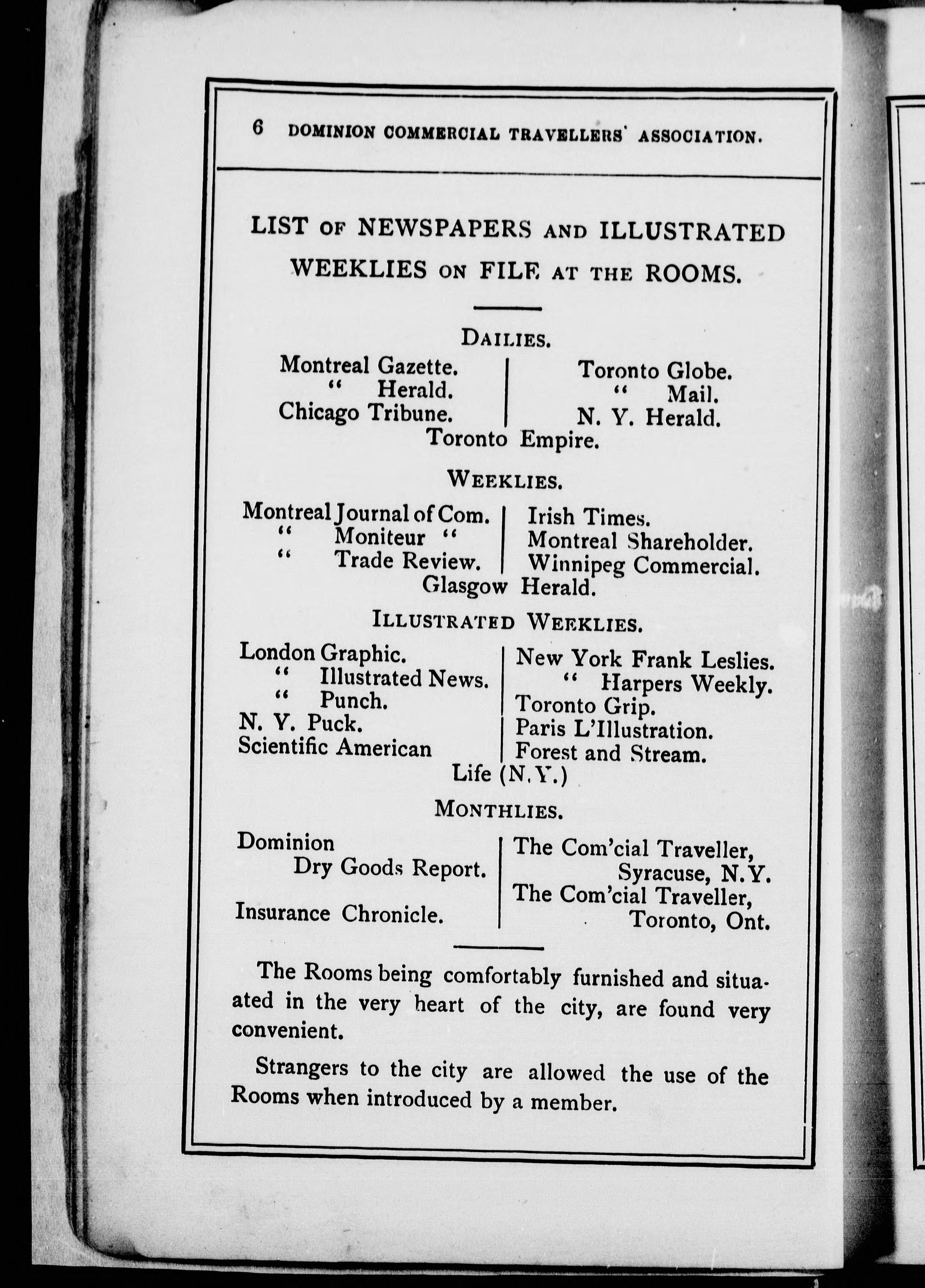 Constitution of the Dominion Commercial Travellers' Association, Montreal : instituted A.D. 1875, incorporated by Dominion Act of Parliament A.D. 1880, also by-laws as revised at annual meeting, December 10th, 1887, and list of members for 1887. - Adresse bibliographique