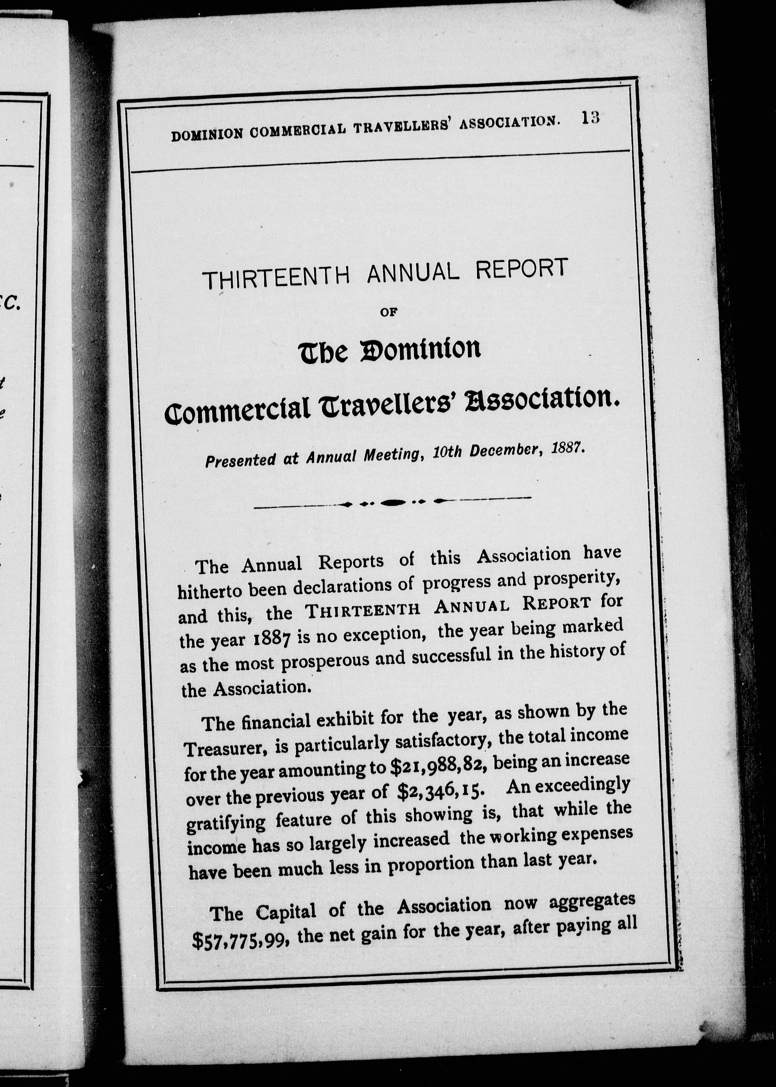 Constitution of the Dominion Commercial Travellers' Association, Montreal : instituted A.D. 1875, incorporated by Dominion Act of Parliament A.D. 1880, also by-laws as revised at annual meeting, December 10th, 1887, and list of members for 1887. - Adresse bibliographique