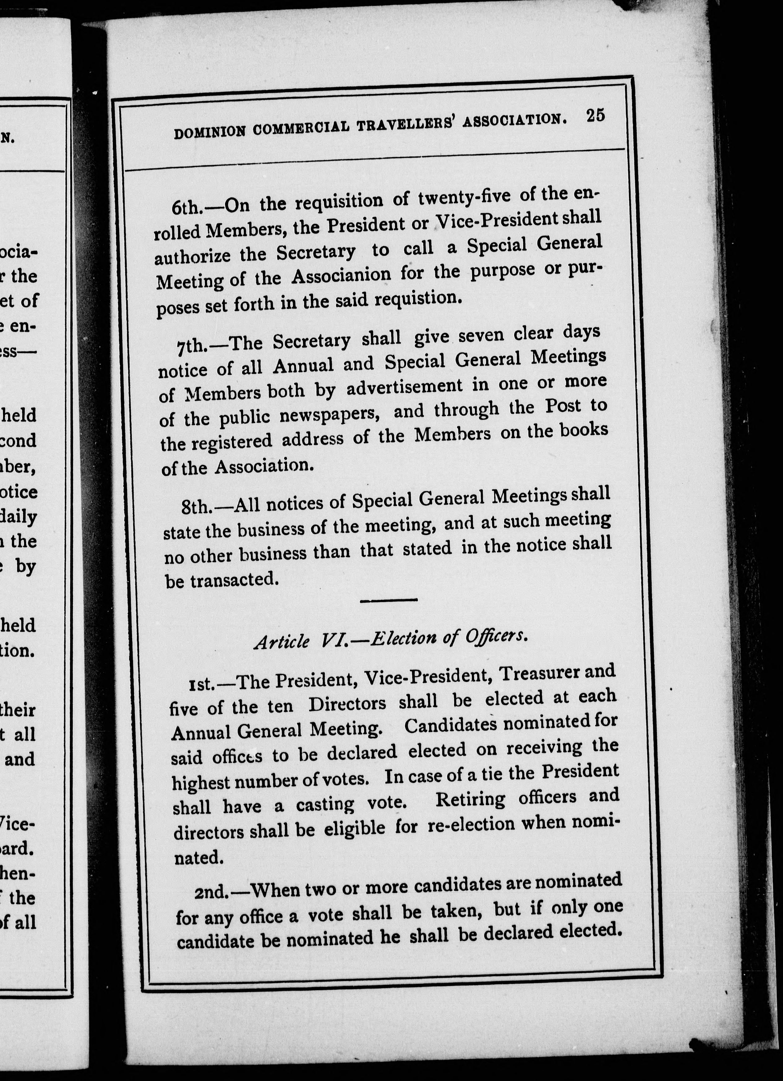 Constitution of the Dominion Commercial Travellers' Association, Montreal : instituted A.D. 1875, incorporated by Dominion Act of Parliament A.D. 1880, also by-laws as revised at annual meeting, December 10th, 1887, and list of members for 1887. - Adresse bibliographique