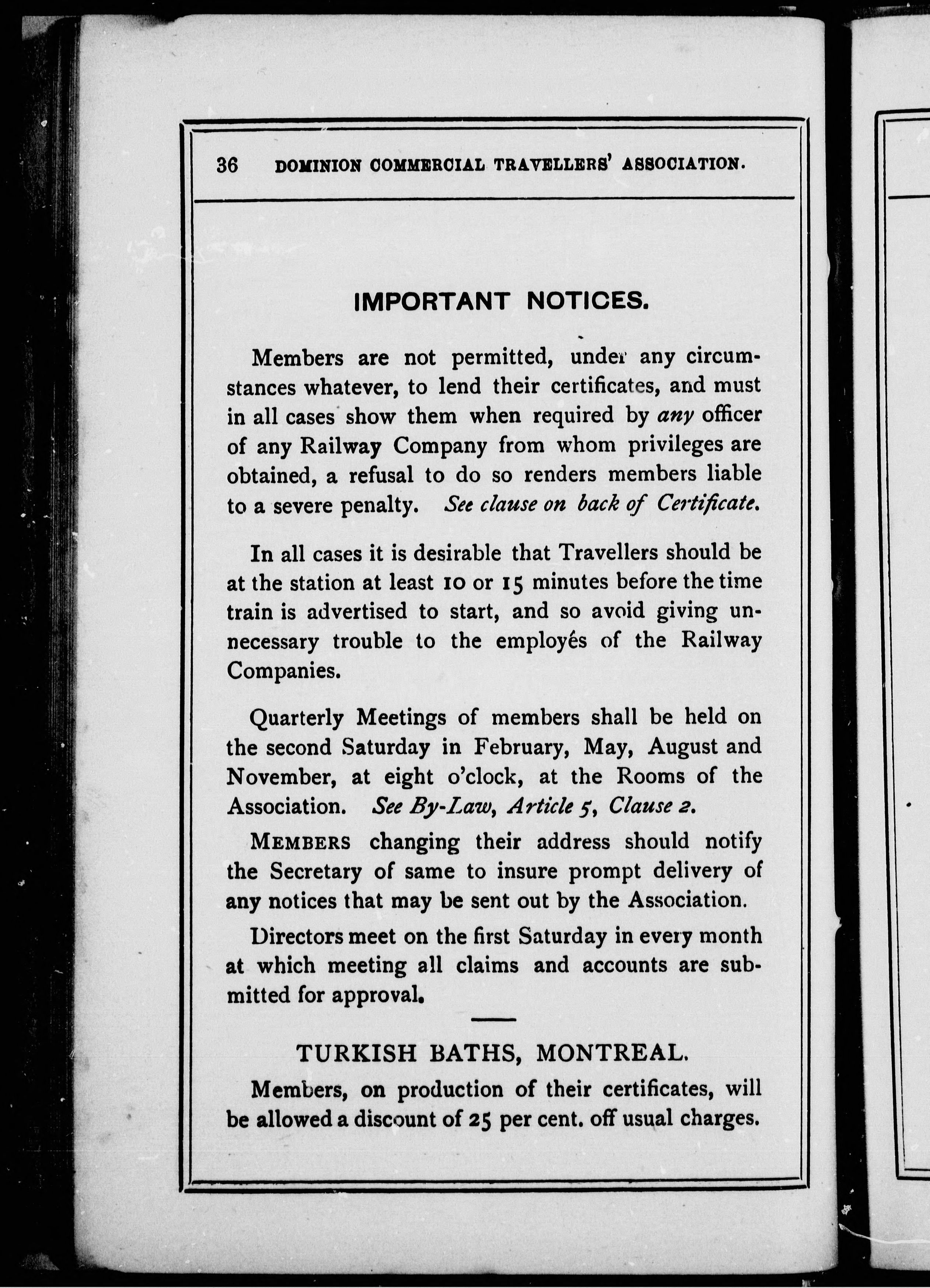 Constitution of the Dominion Commercial Travellers' Association, Montreal : instituted A.D. 1875, incorporated by Dominion Act of Parliament A.D. 1880, also by-laws as revised at annual meeting, December 10th, 1887, and list of members for 1887. - Adresse bibliographique